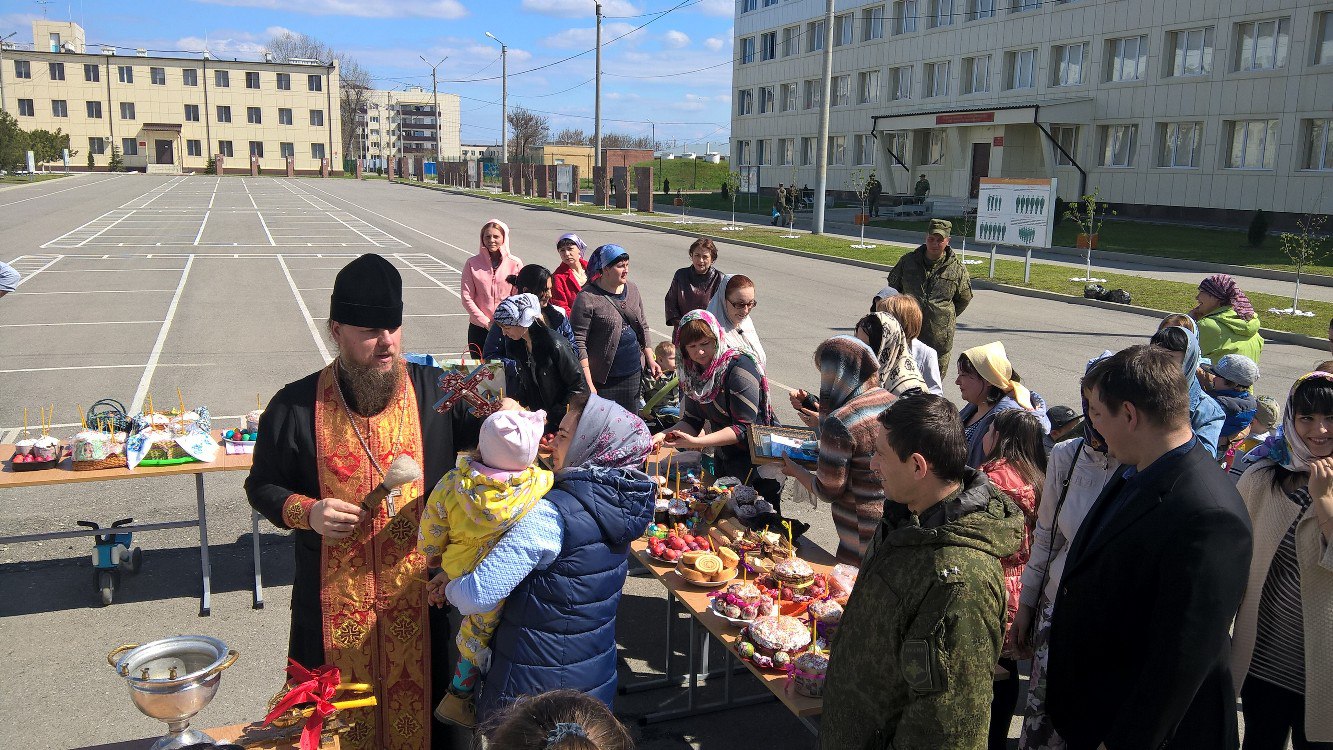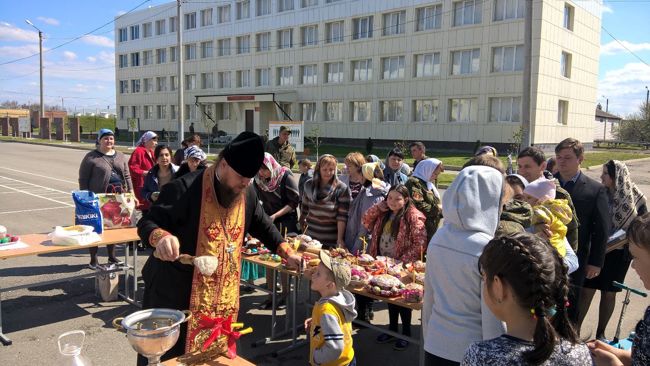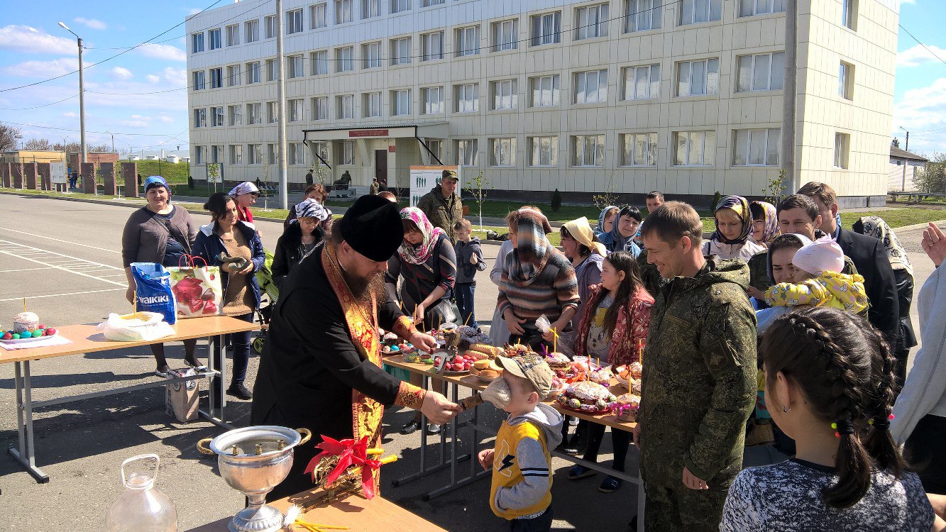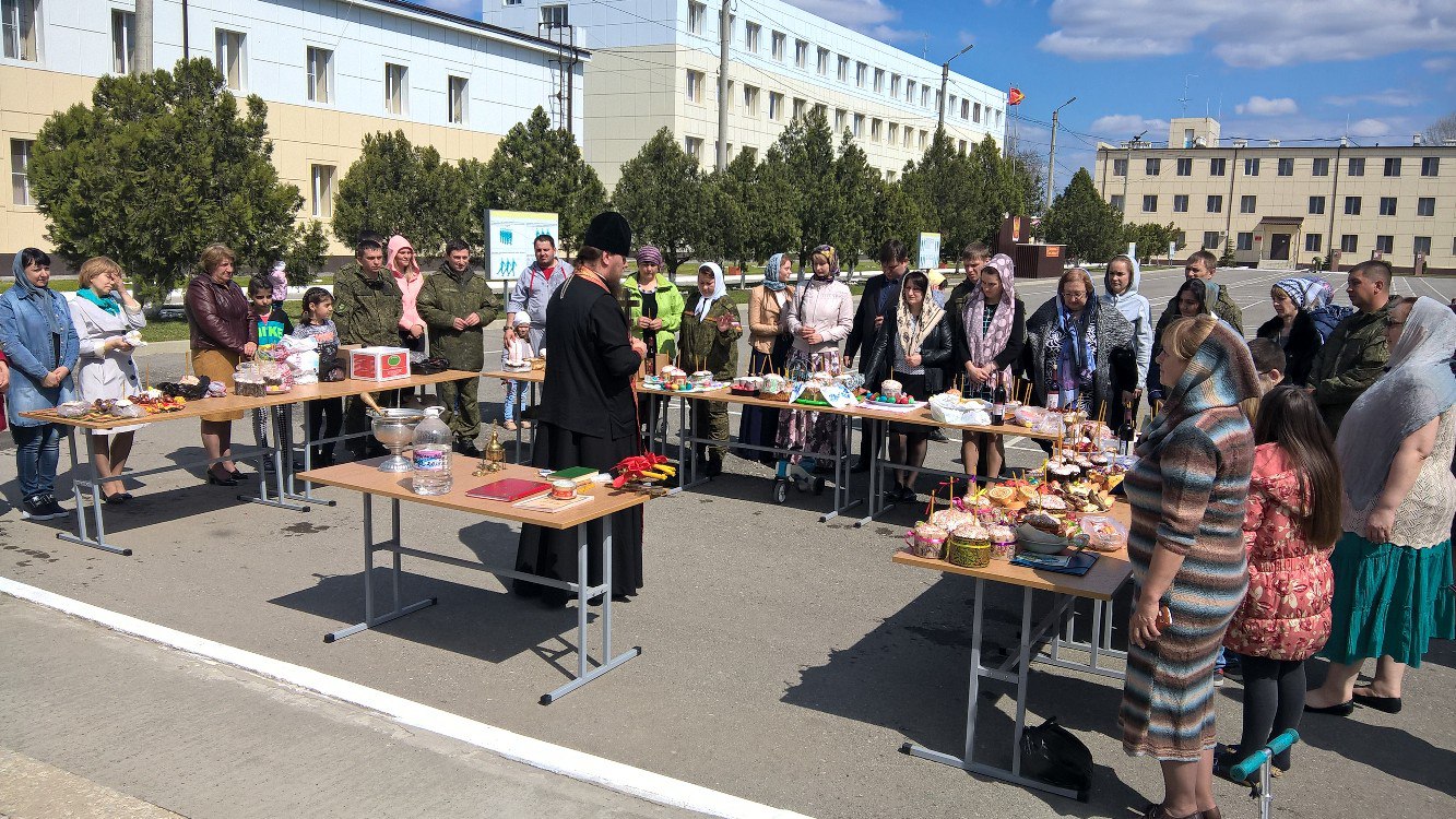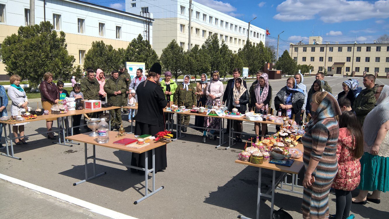 Священнослужитель совершил на территории части чин освящения пасхальной снеди и поздравил военнослужащих и членов их семей со светлым праздником Пасхи.