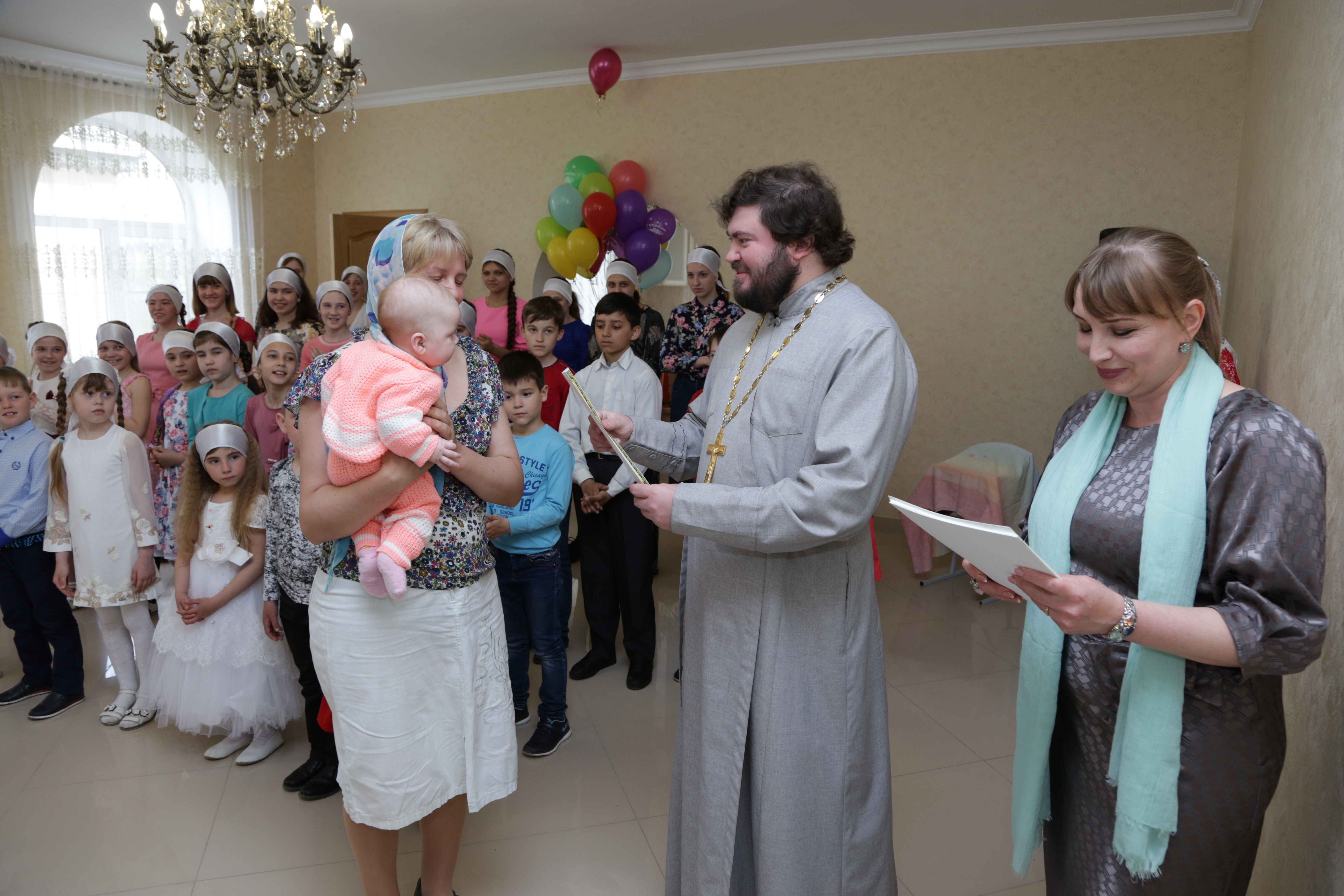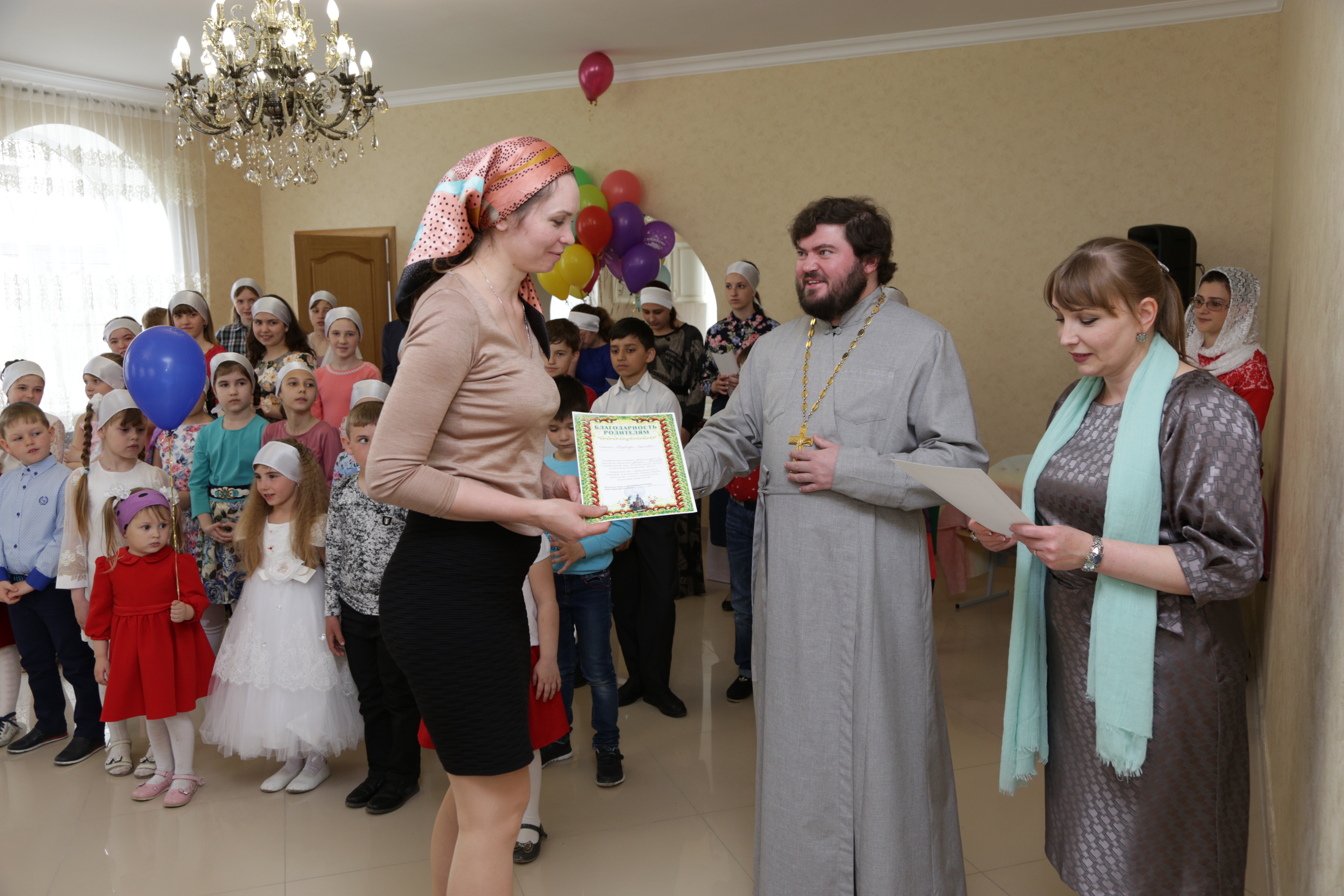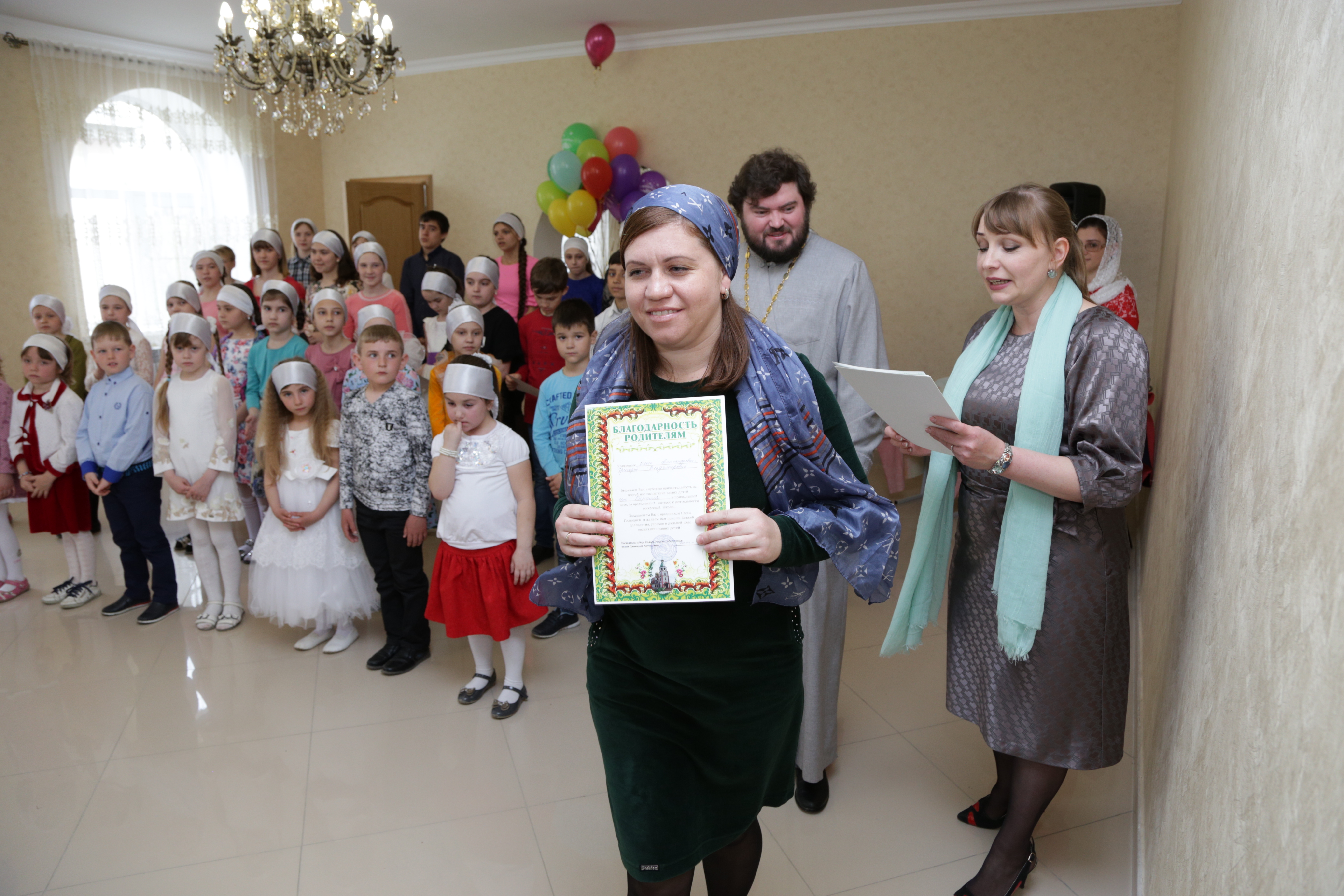 С приветственным словом к собравшимся обратился отец Димитрий. Батюшка поздравил всех со светлым праздником и вручил благодарности родителям воспитанников воскресной школы за активную деятельность в жизни школы.