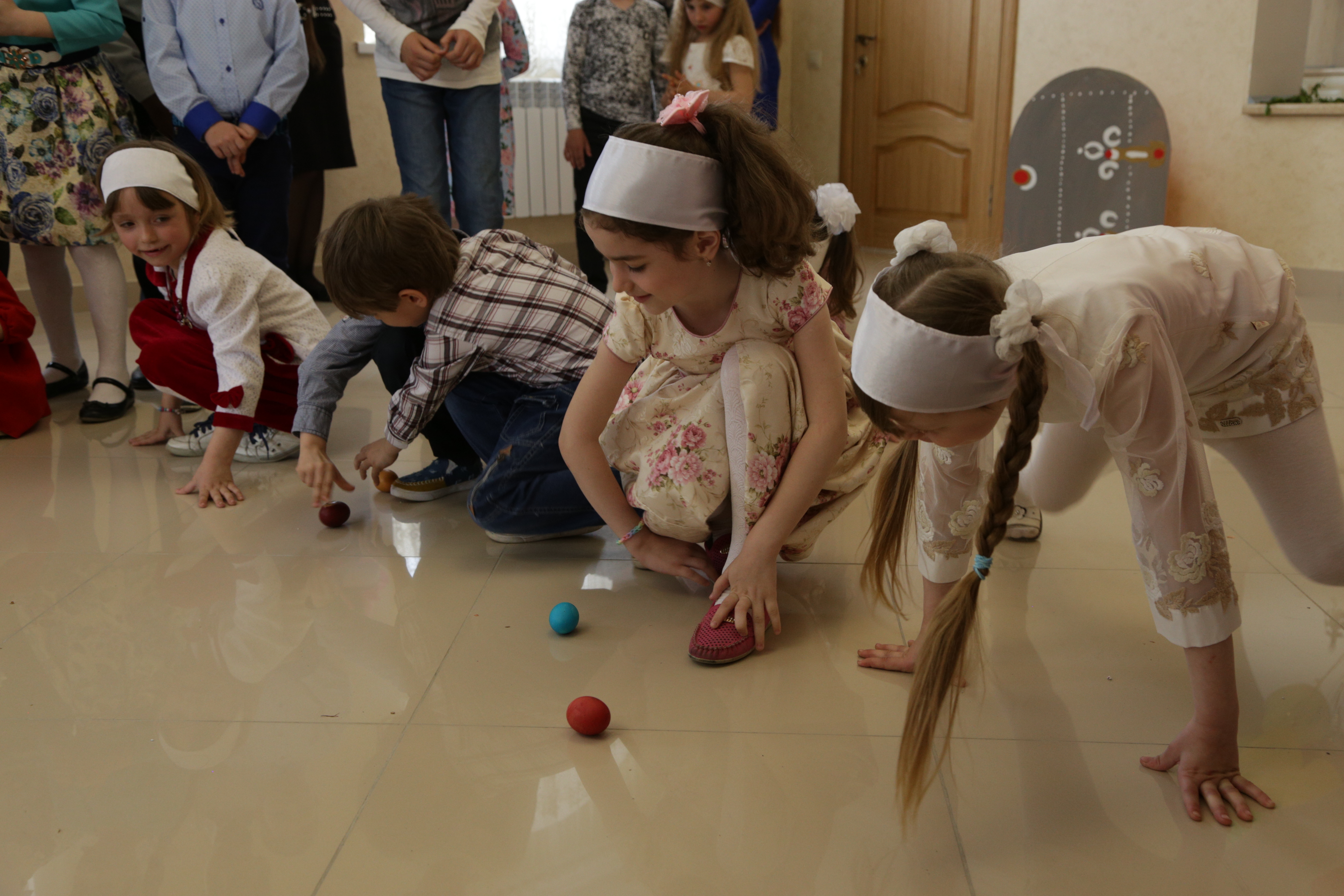 Не обошлось без традиционных пасхальных игр. Яйца катали, крутили и бились ими.