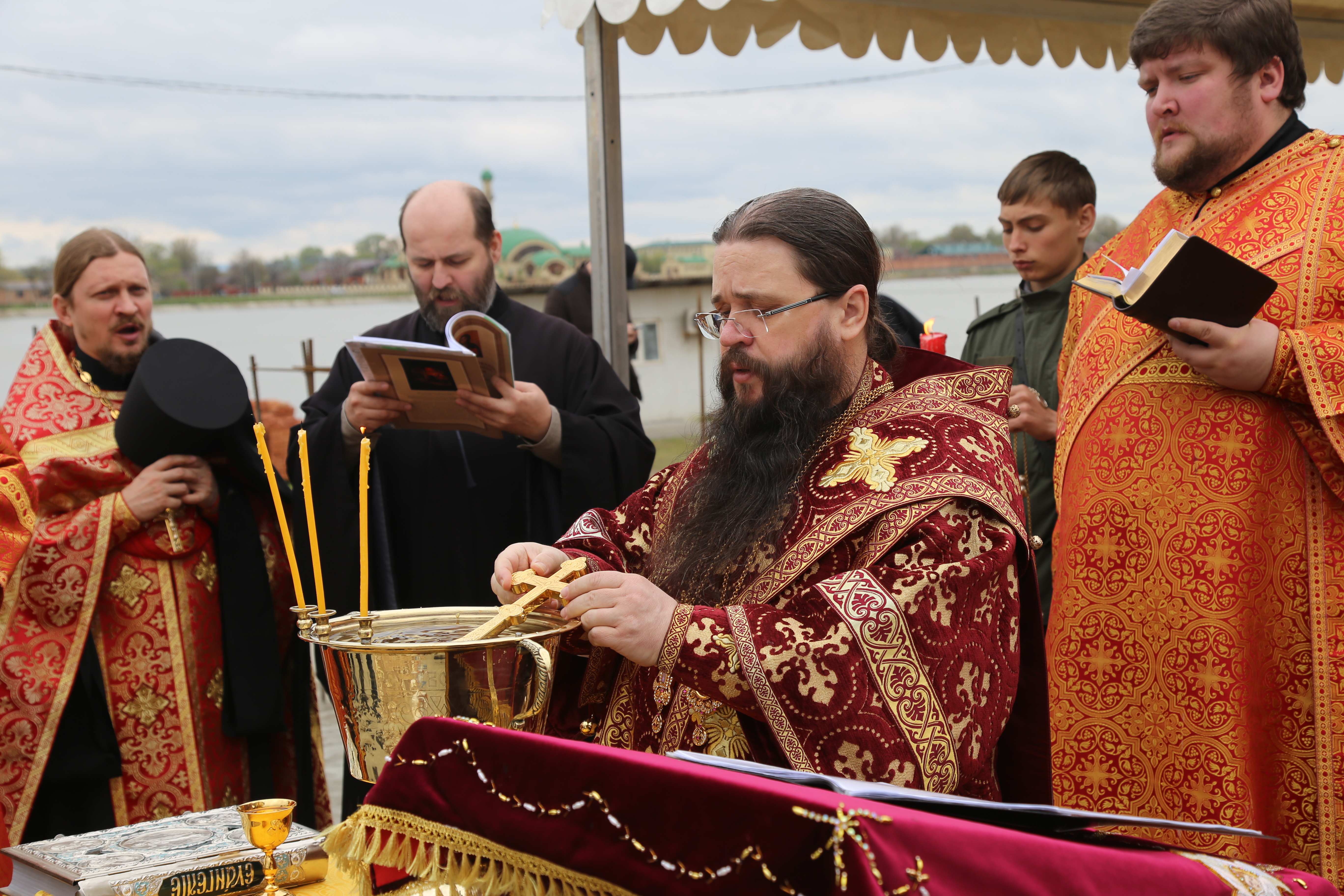 Его Преосвященству сослужили секретарь епархии иеромонах Иоанн (Анисимов), благочинный Наурского церковного округа иеромонах Амвросий (Марченко), благочинный Грозненского церковного округа иерей Сергий Абасов, настоятель храма великомученицы Варвары в Шелковской иерей Сергий Коваленко, клирики Махачкалы.