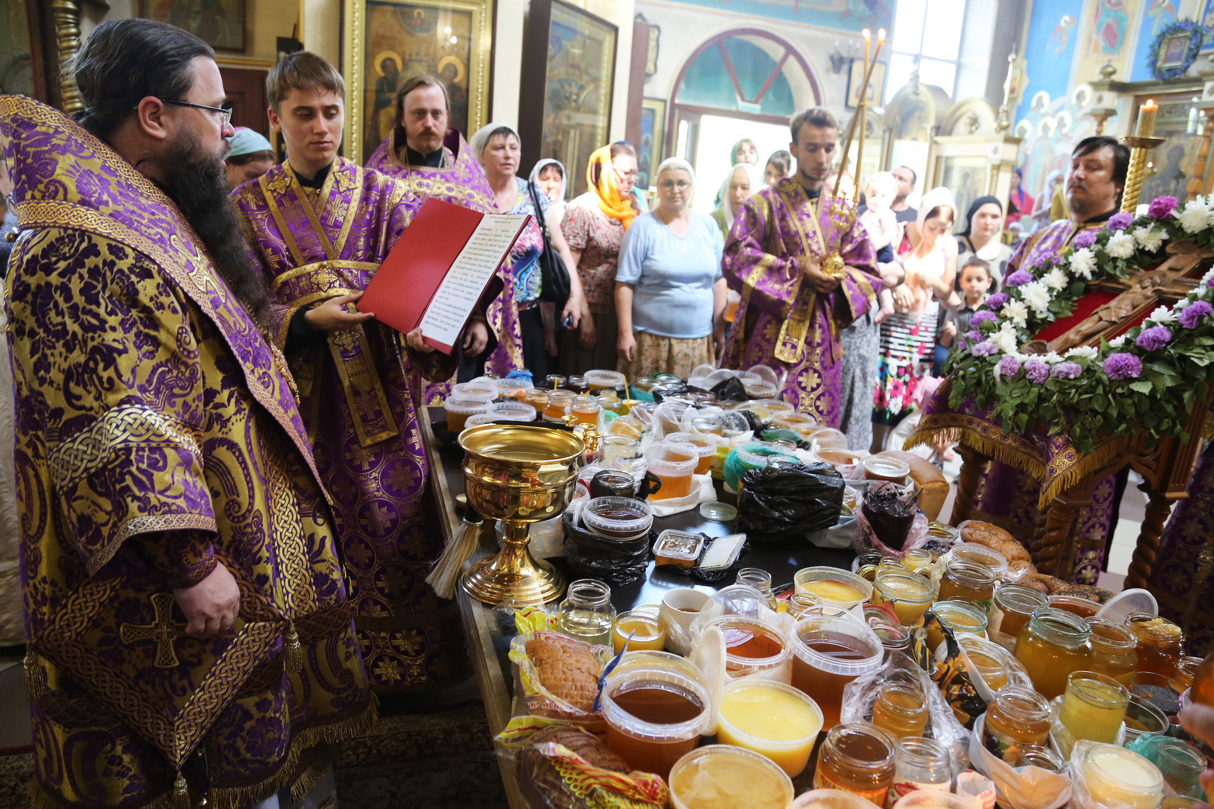 По заамвонной молитве архипастырь вознес молитву на благословение нового меда и окропил его святой водой.