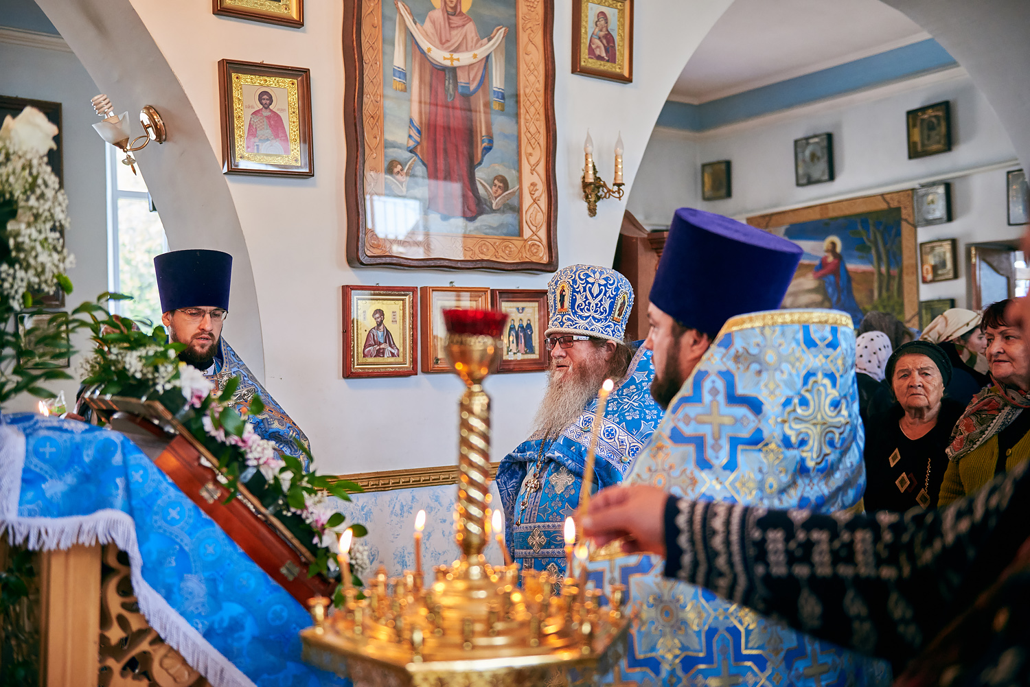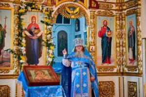 Затем отец Николай поздравил духовенство и прихожан с престольным праздником и призвал с чистым сердцем возносить молитвы к нашей Небесной Матери, простирающей Свой Державный Покров, о заступлении, спасении и помиловании всех нас.