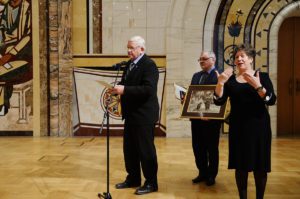 Президент Всероссийского общества глухих Валерий Рухледев вручил Патриарху Кириллу высшую награду Всероссийского общества глухих ― нагрудный знак «Почетный член ВОГ». Также президент ВОГ преподнес Предстоятелю картину известного неслышащего художника-графика и преподавателя живописи Михаила Горюнова «Юный постриженик» (игумен Митрофан благословляет преподобного Сергия Радонежского на иноческий подвиг).