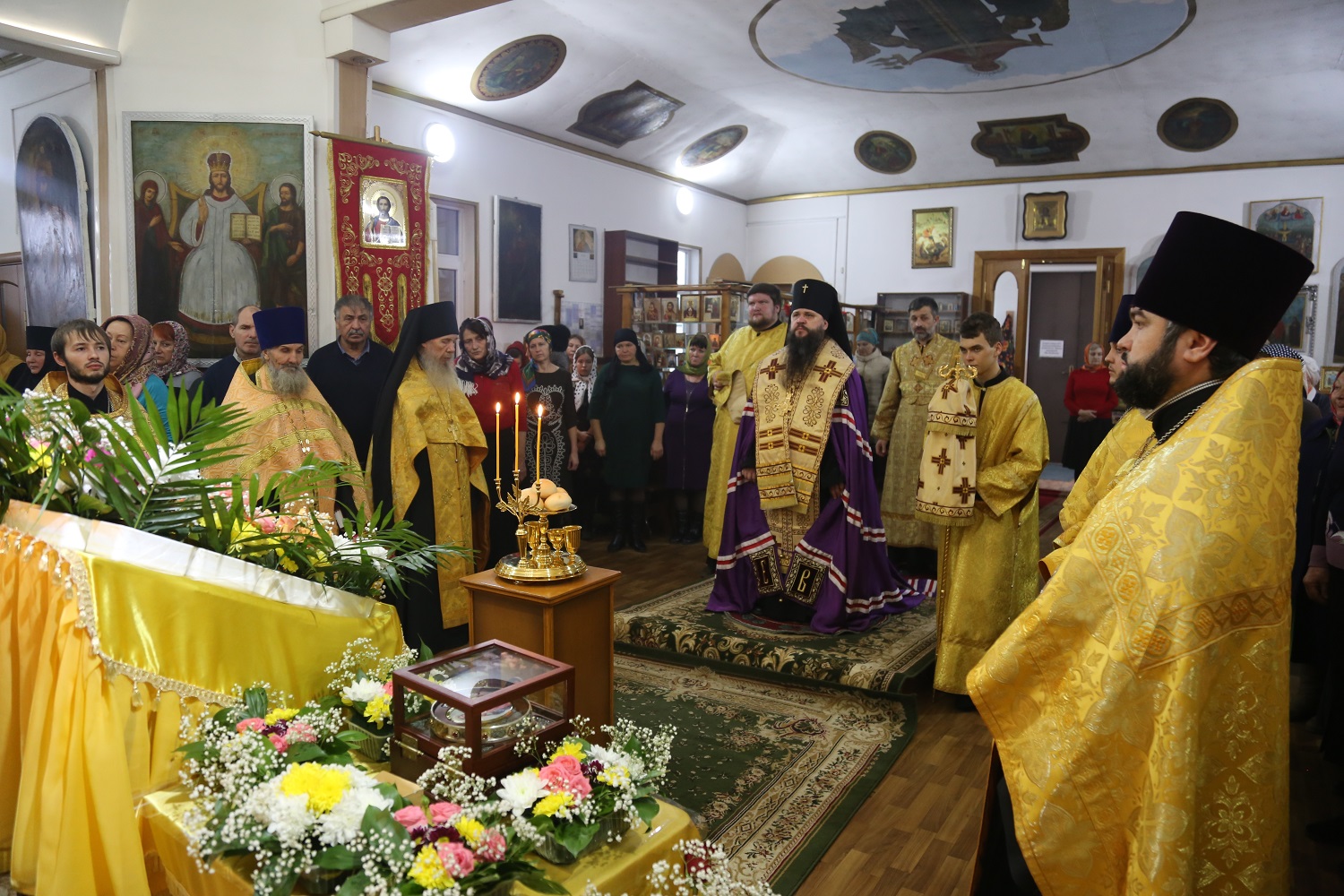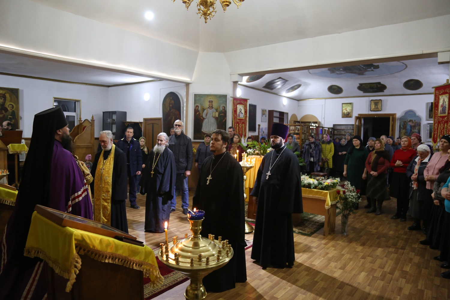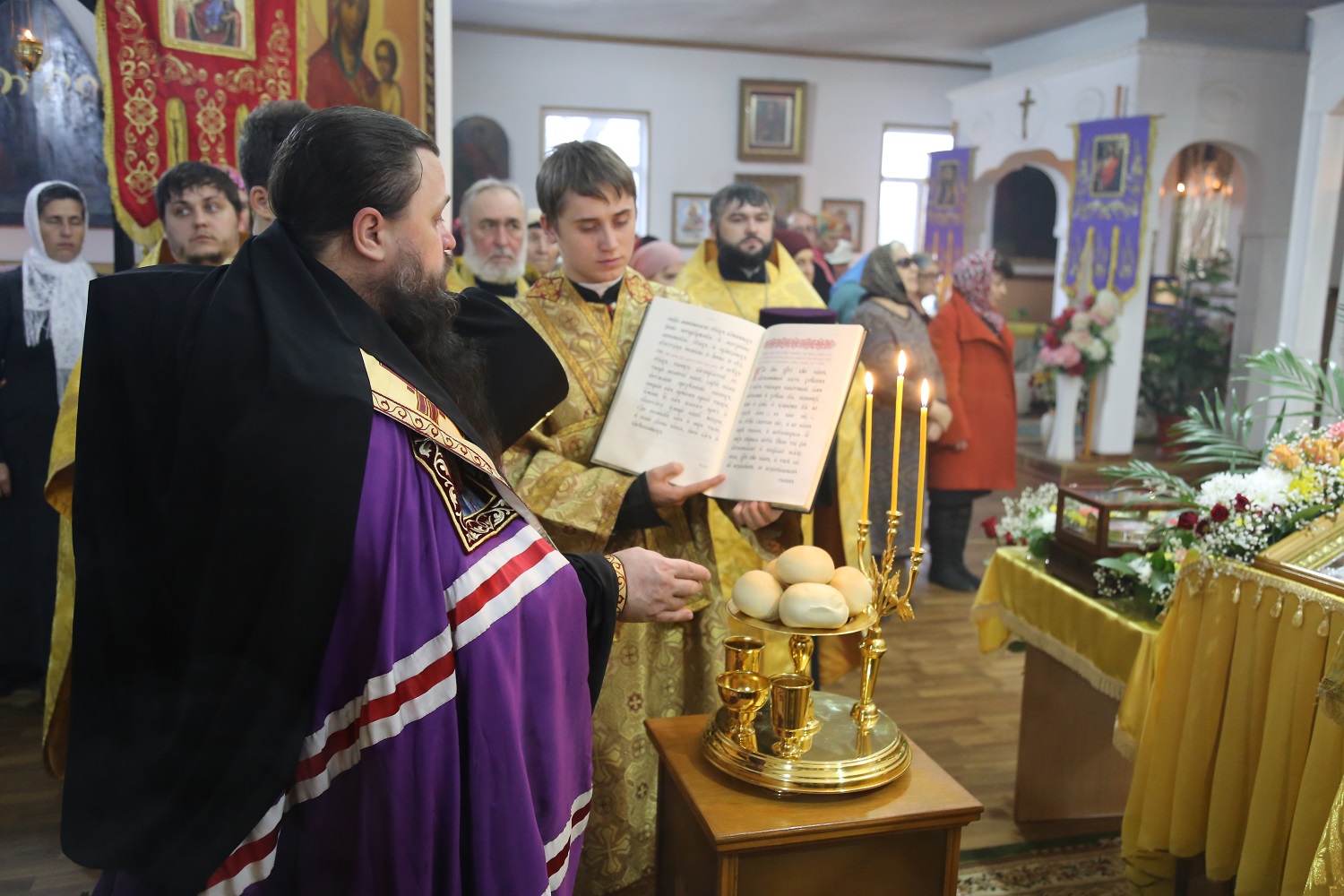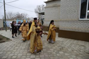Его Высокопреосвященству сослужили секретарь епархии иеромонах Иоанн (Анисимов), настоятель Никольского храма в Кочубее протоиерей Андрей Карачаров, клирики Свято-Успенского кафедрального собора г. Махачкалы.