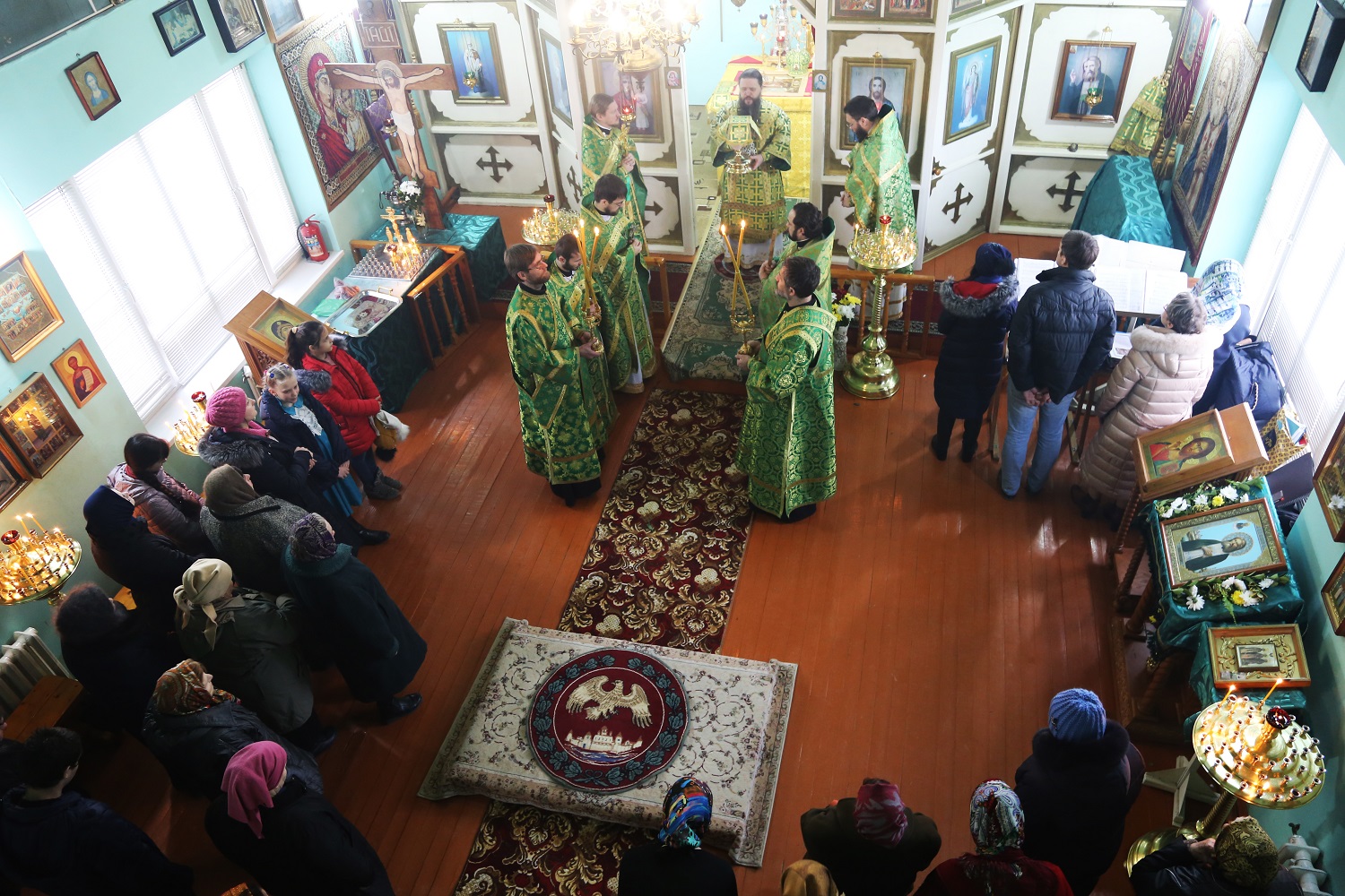 За Божественной литургией Его Высокопреосвященству сослужили секретарь епархии иеромонах Иоанн (Анисимов), благочинный Махачкалинского церковного округа иерей Виталий Тарасов, настоятель храма в честь преподобного Серафима Саровского в г. Избербаше иерей Олег Шальнов, штатный клирик Свято-Покровского храма в г. Дербенте РД иерей Михаил Лобов, клирики Свято-Успенского кафедрального собора г. Махачкалы.