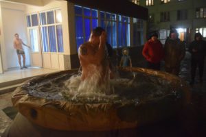 Отец Сергий совершил чин великого освящения воды и благословил специально оборудованную купель, после чего все желающие из числа военнослужащих смогли совершить традиционные крещенские купания.