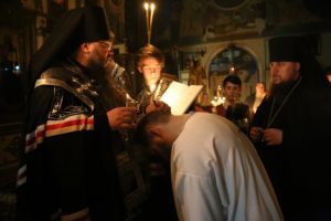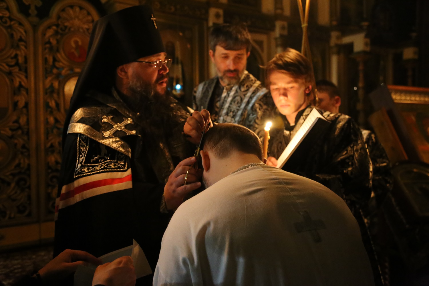 После троекратного обращения к иеродиакону Кириллу с вопросом о решимости принять ангельский образ, получив от него согласие, архипастырь крестообразно остриг ему волосы и нарек новое имя.