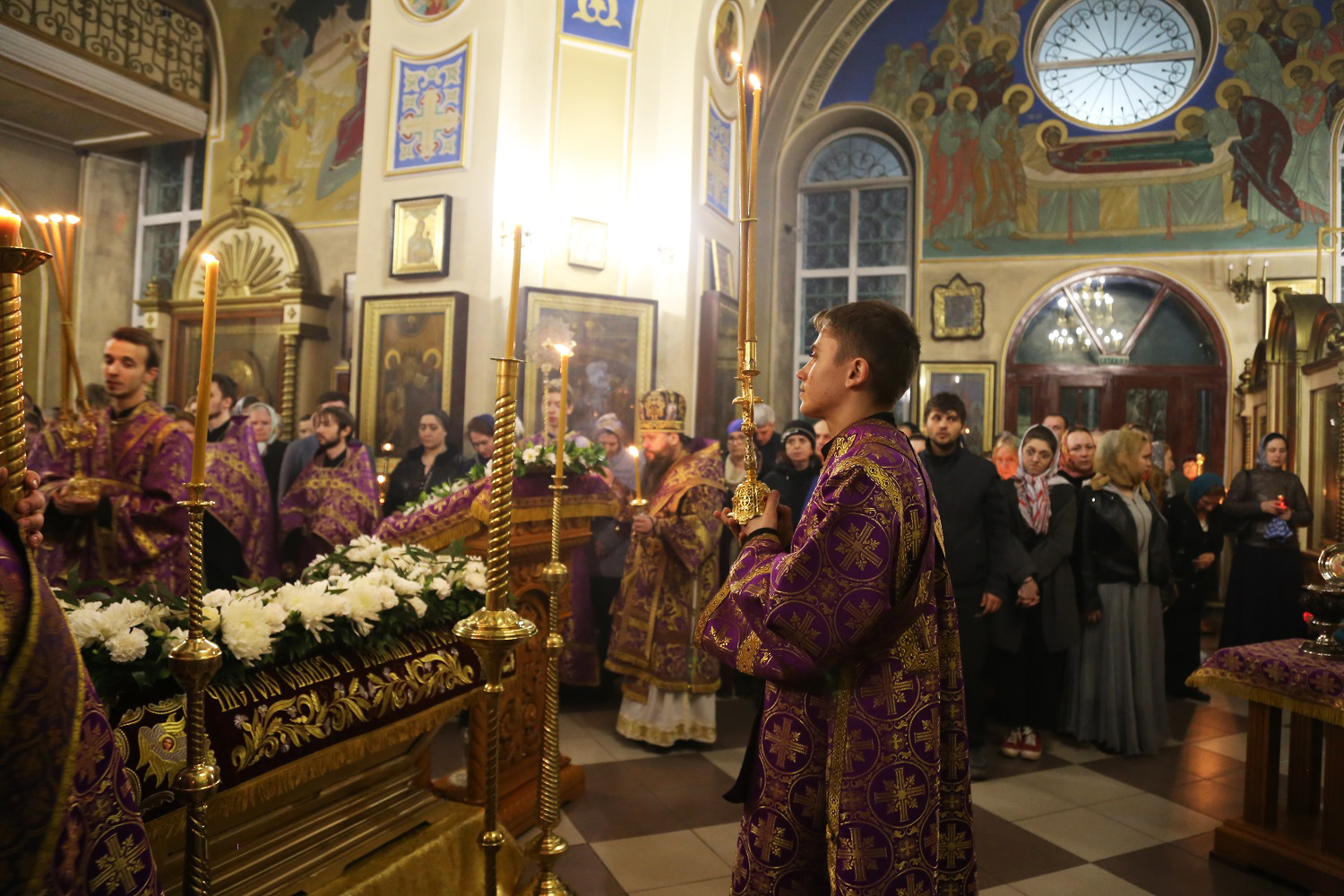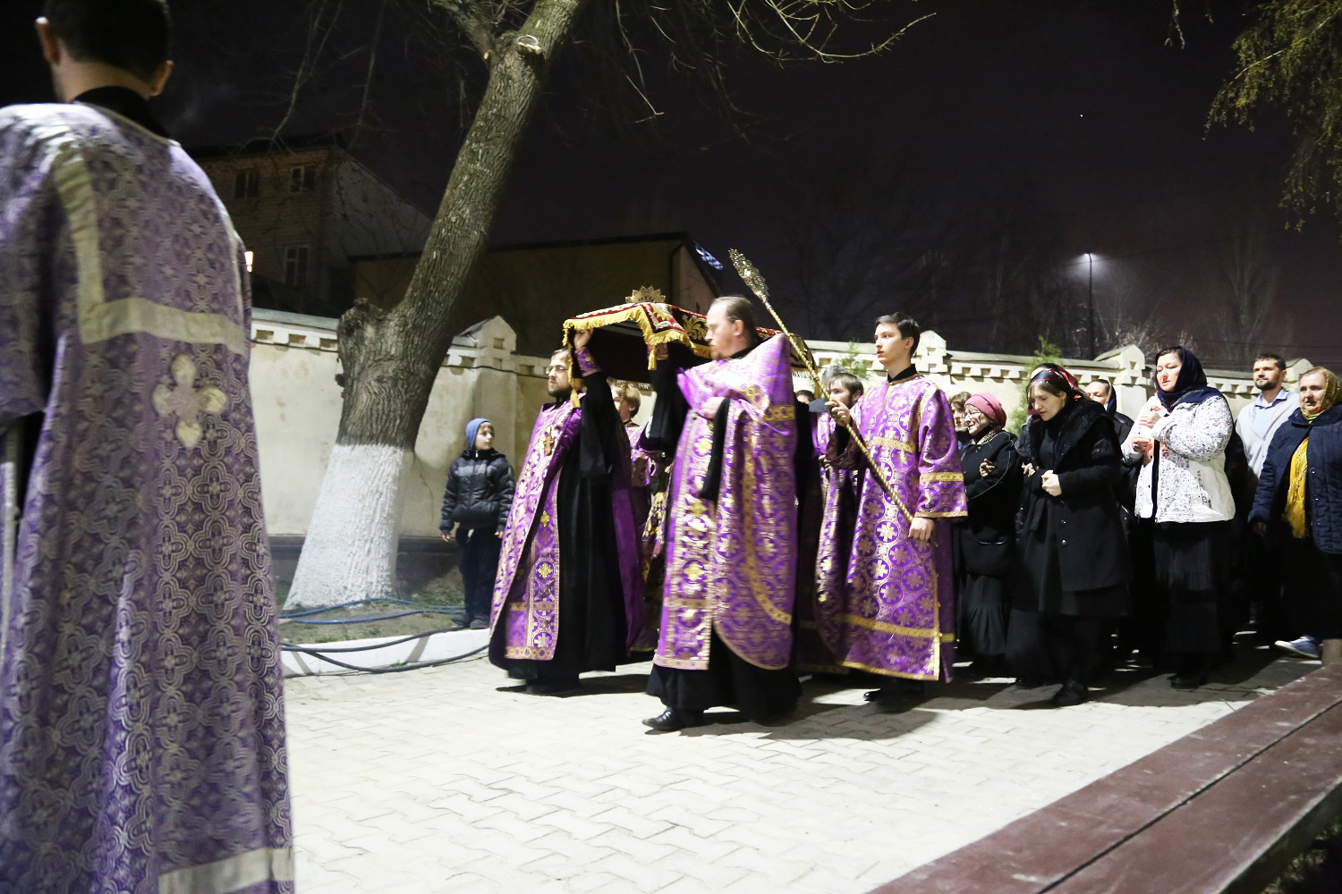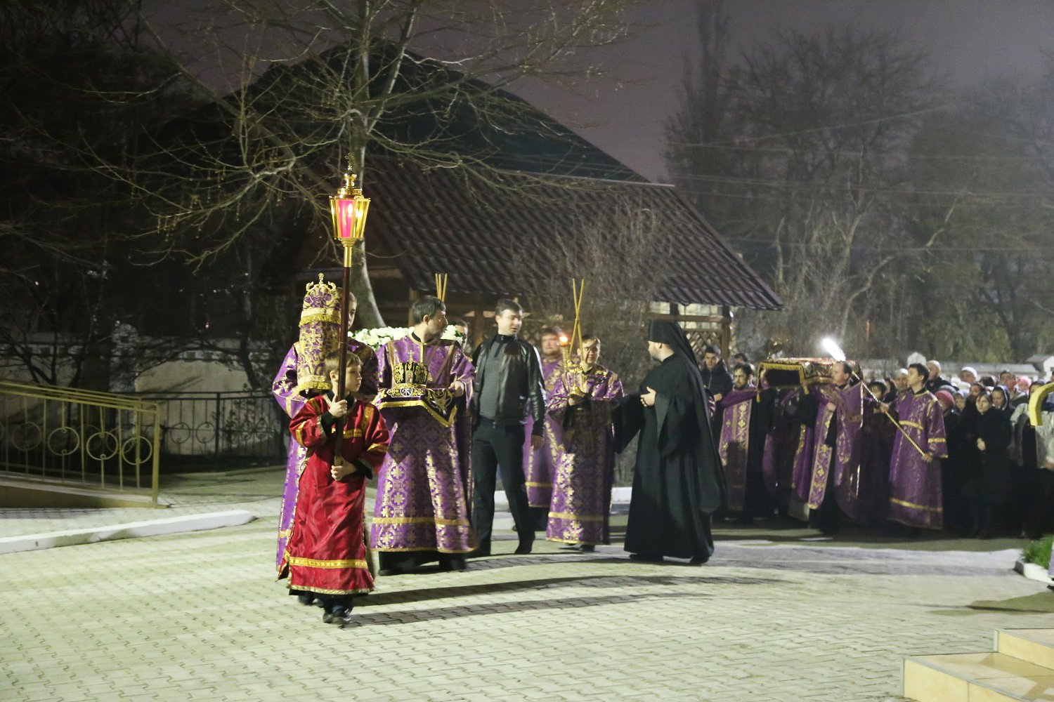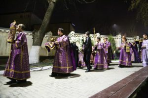 После великого славословия с пением погребального «Святый Боже» вокруг собора был совершен крестный ход с Плащаницей.