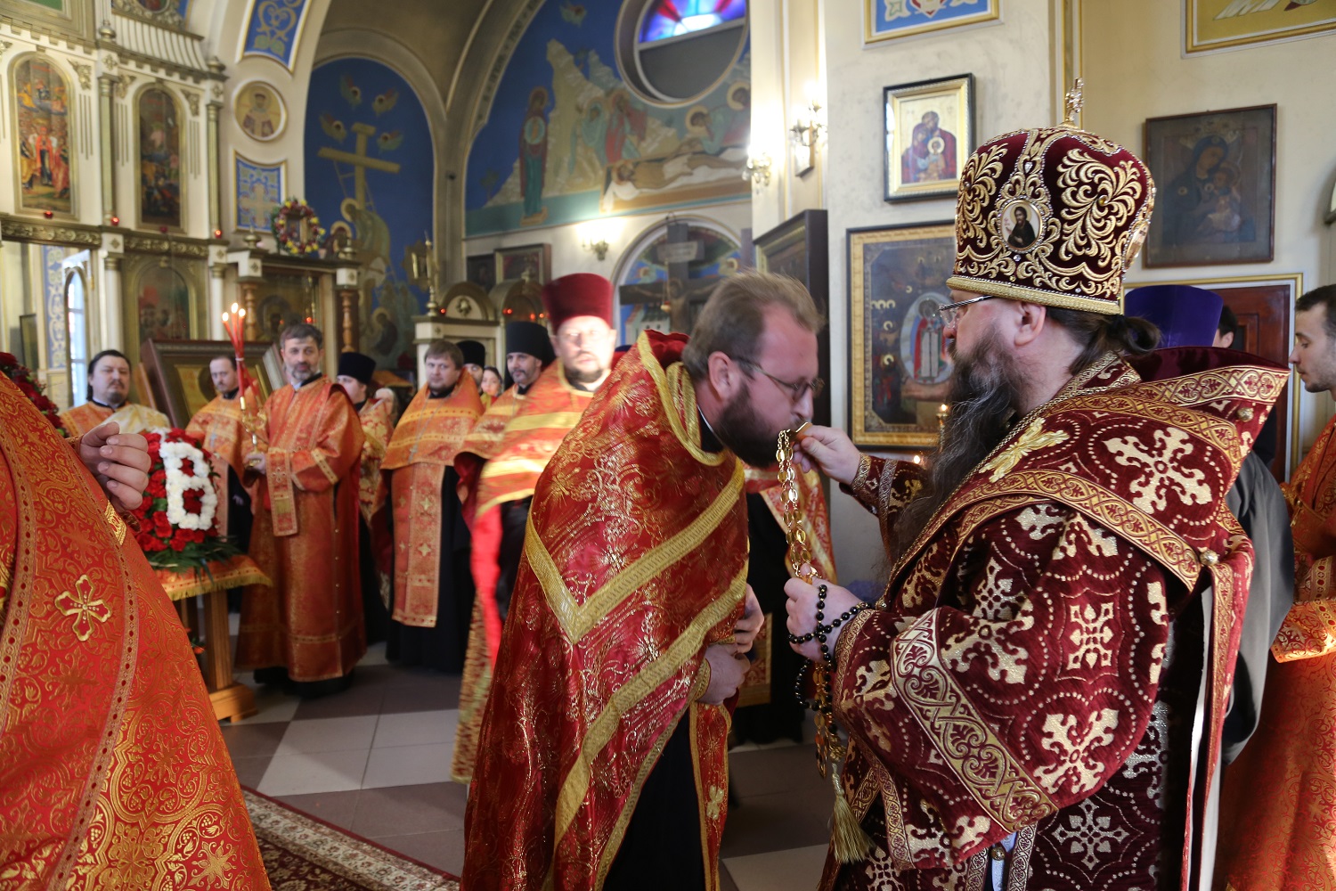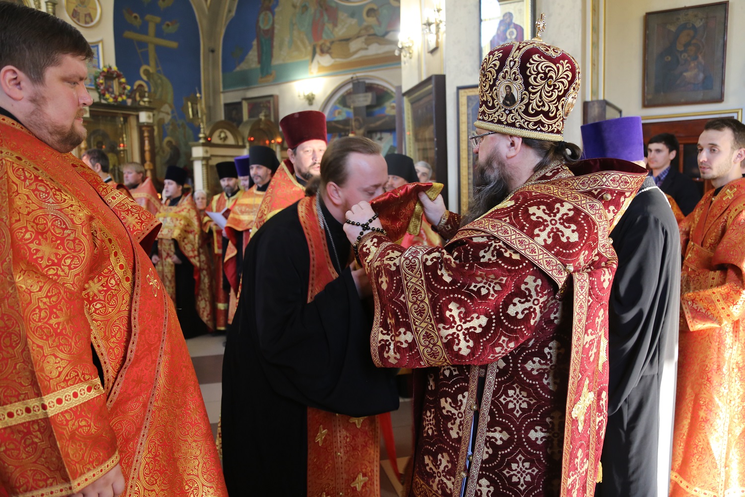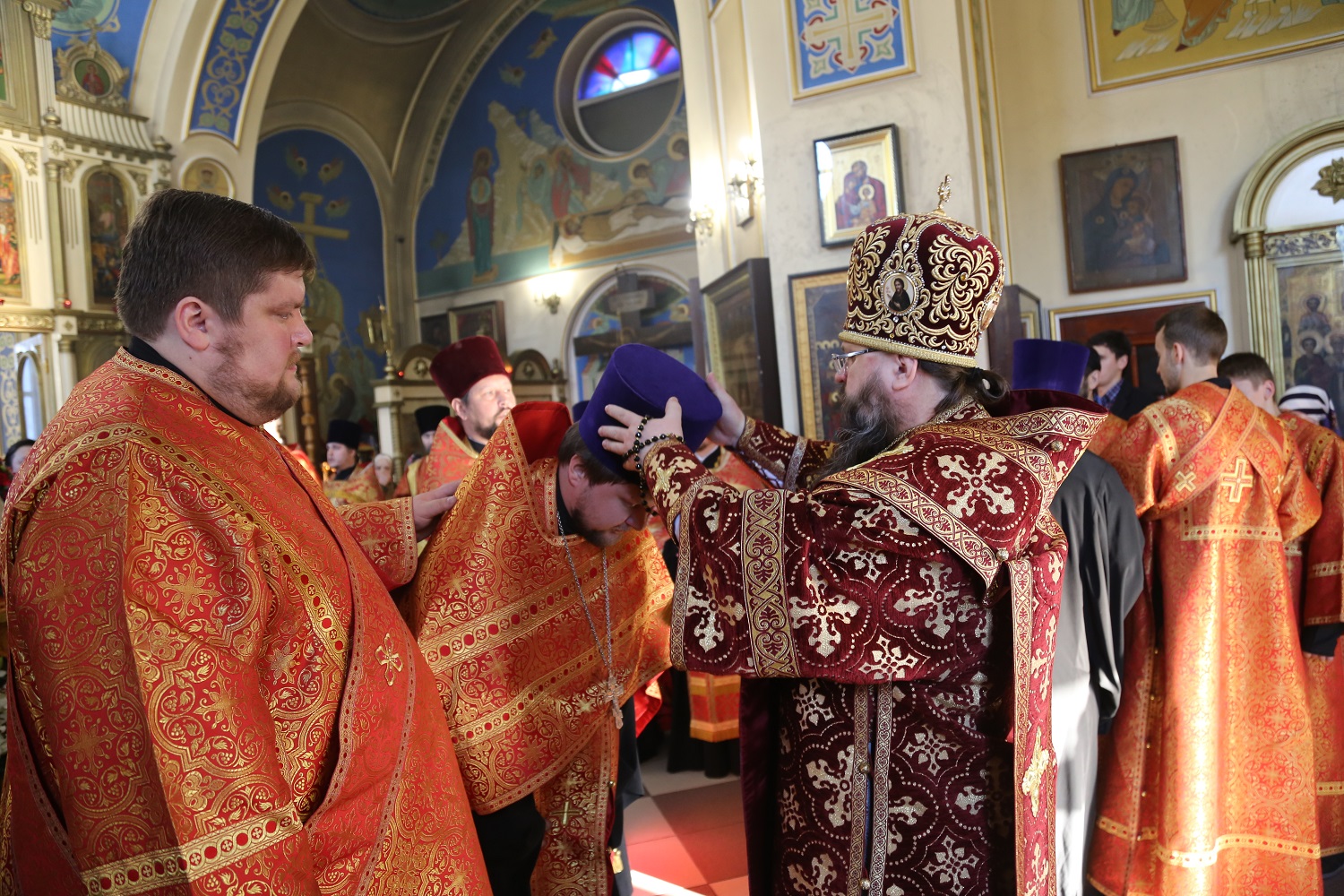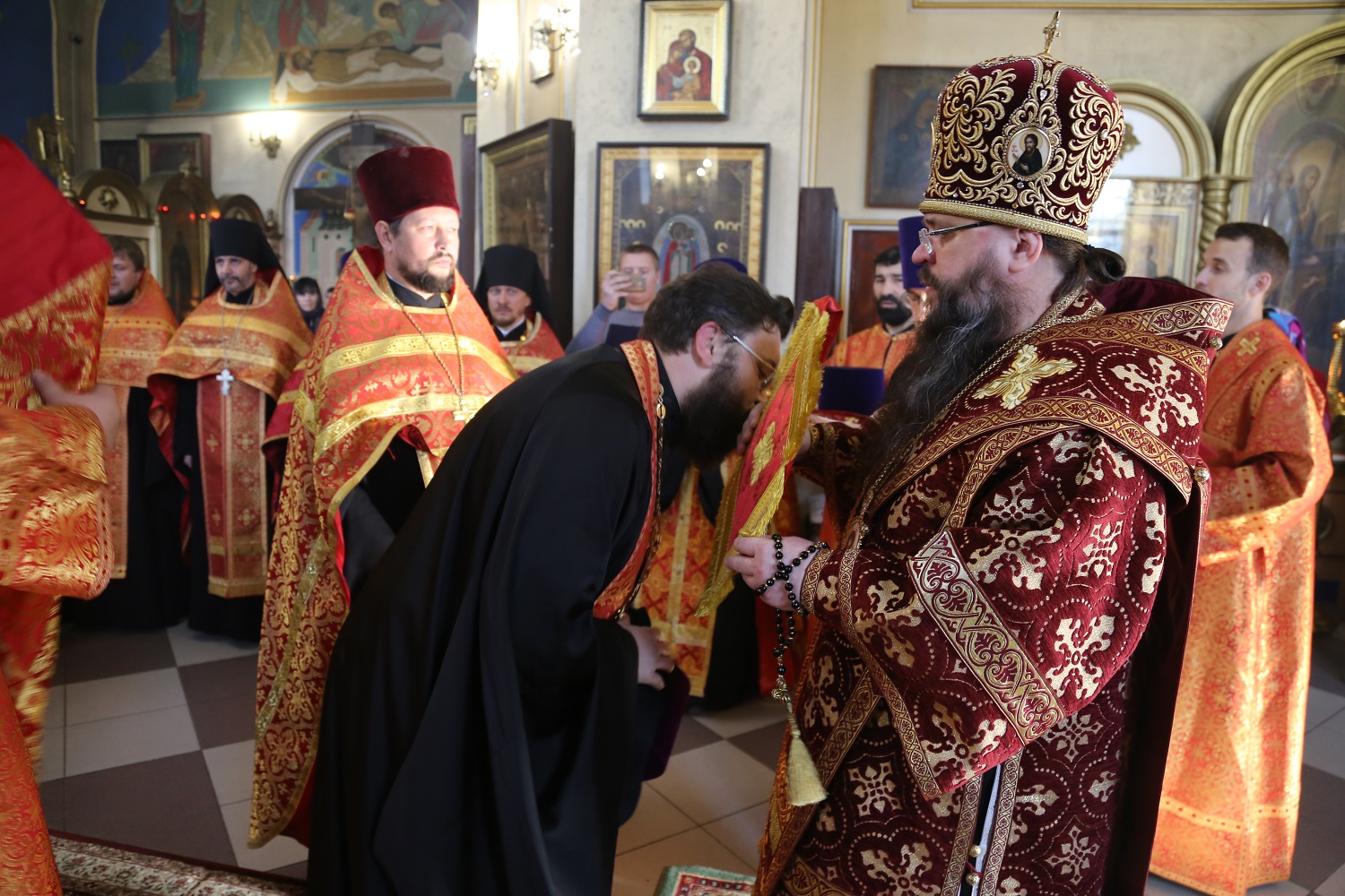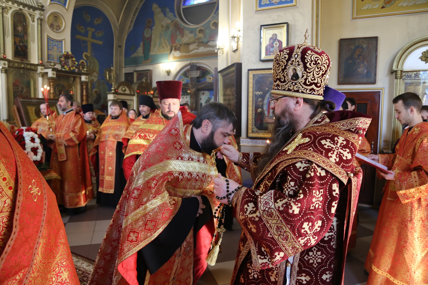 По входе архипастырь раздал богослужебно-иерархические награды священнослужителям.