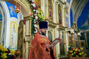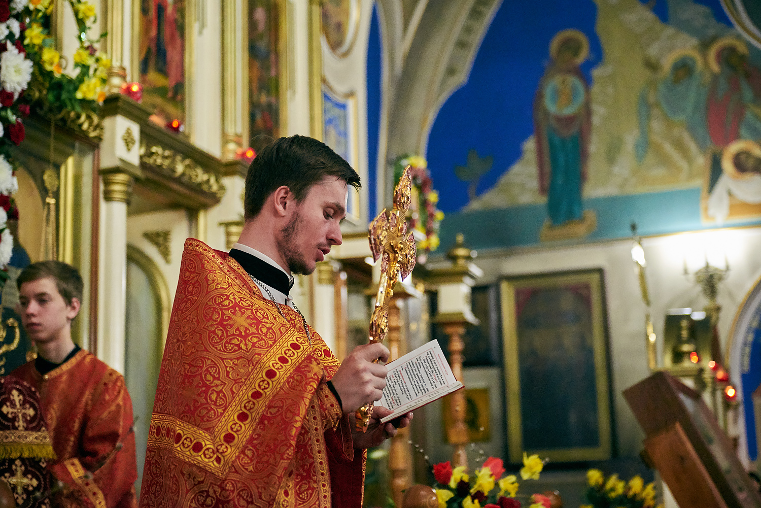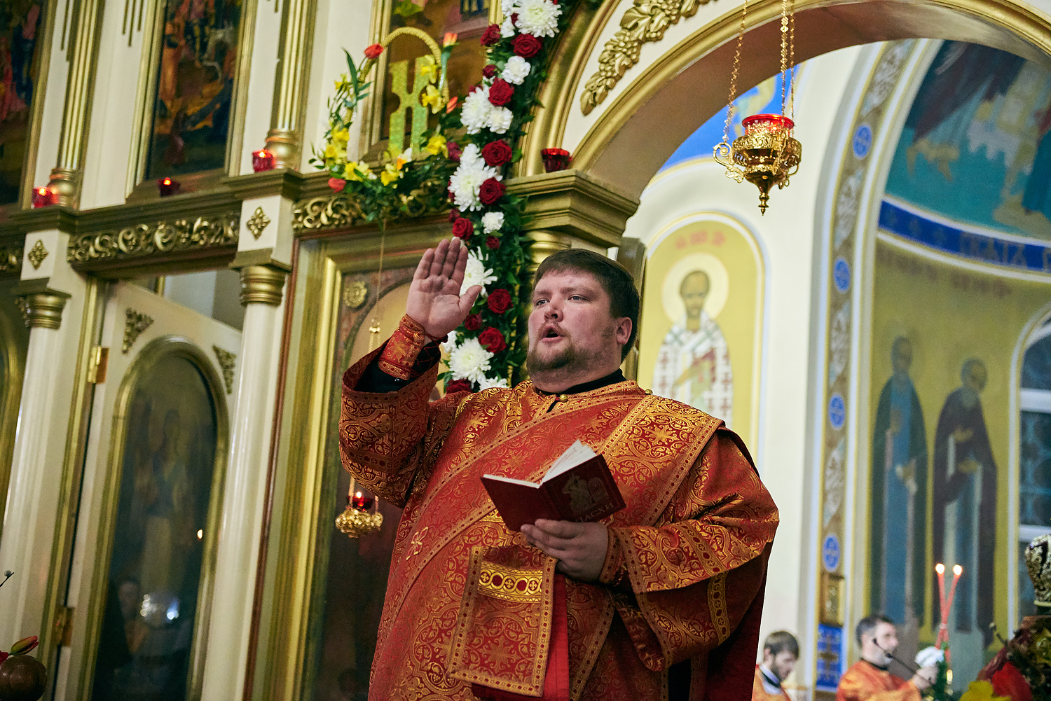По запричастном стихе пасхальное послание архиепископа Махачкалинского и Грозненского Варлаама огласил диакон Александр Никитин.