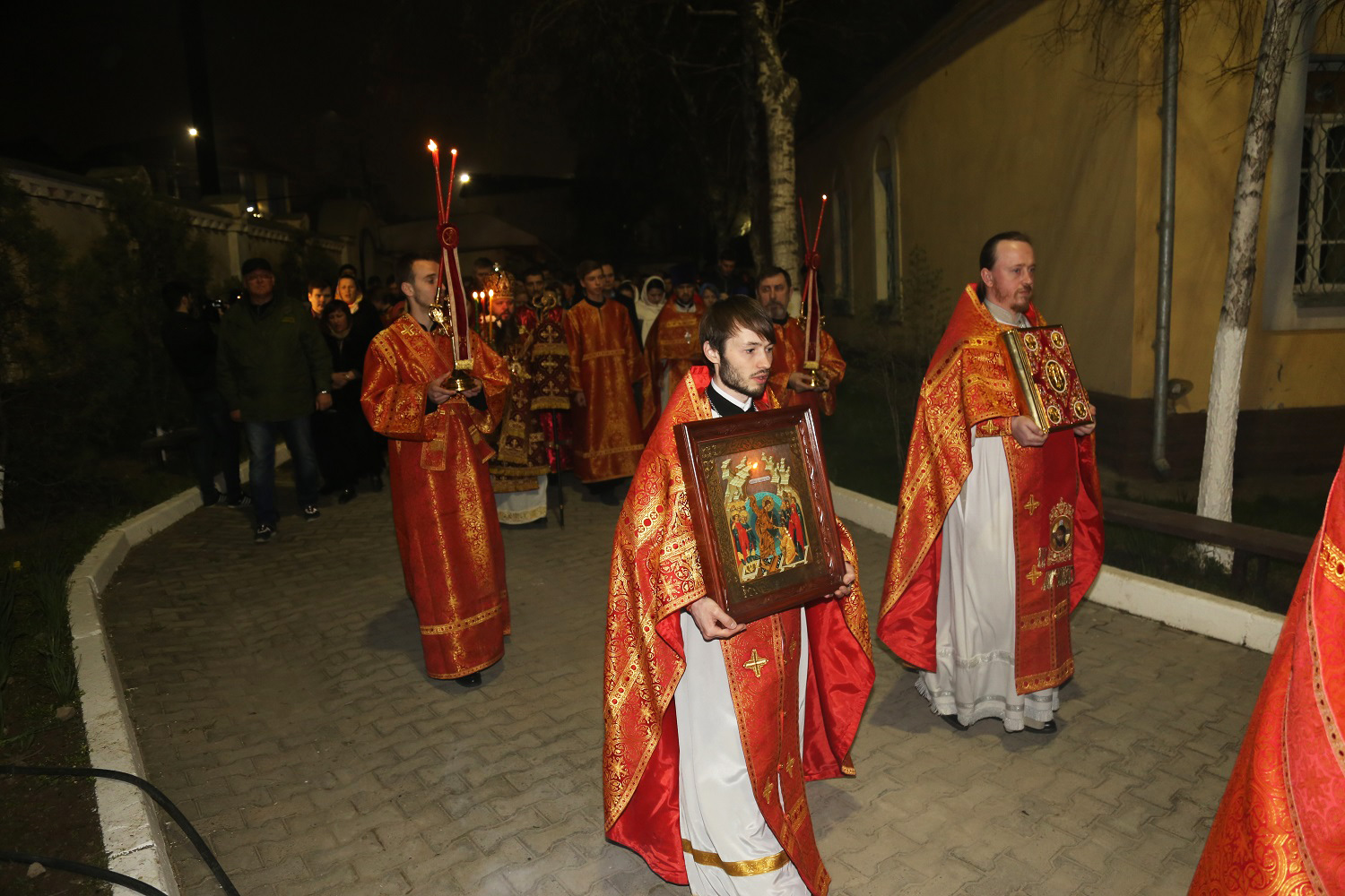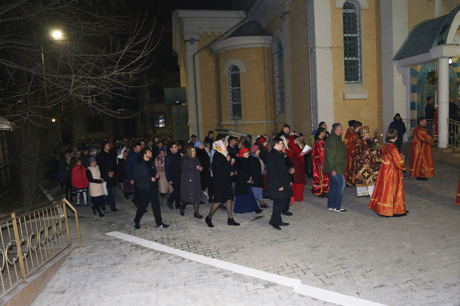 В полночь при пении стихиры «Воскресение Твое, Христе Спасе…» состоялся крестный ход вокруг собора.