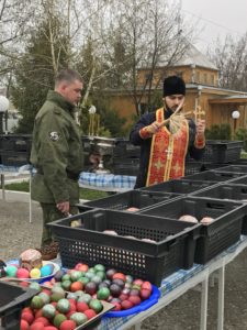 Священнослужитель совершил в воинских частях пасхальные молебные пения, после чего освятил приготовленную пасхальную снедь.