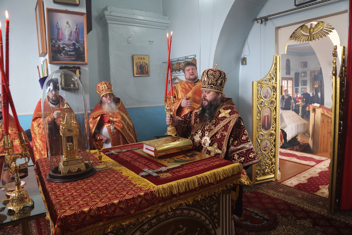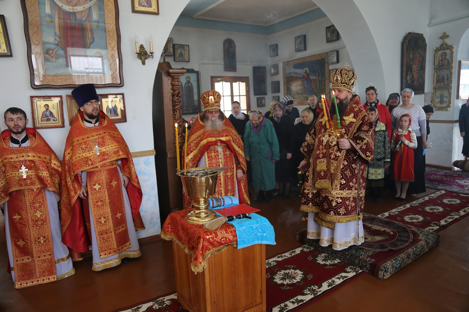 В храме в честь Покрова Пресвятой Богородицы правящий архиерей возглавил Божественную литургию с водосвятным молебном и крестным ходом.