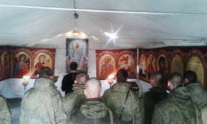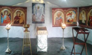 В развернутом в полевых условиях храме священнослужитель совершил пасхальное молебное пение.