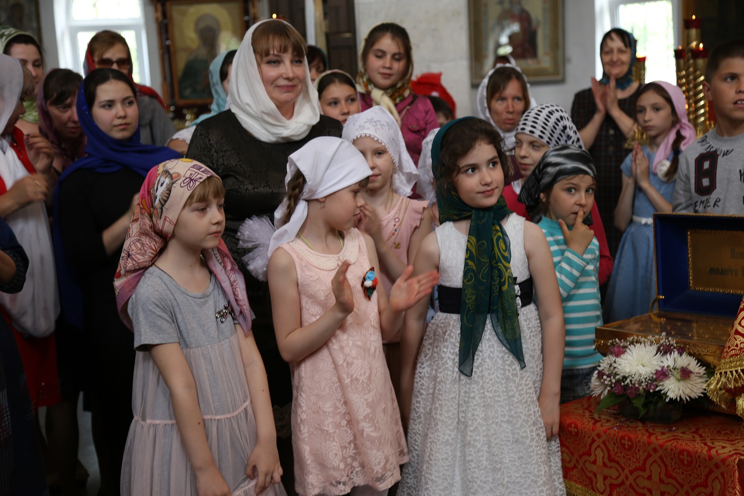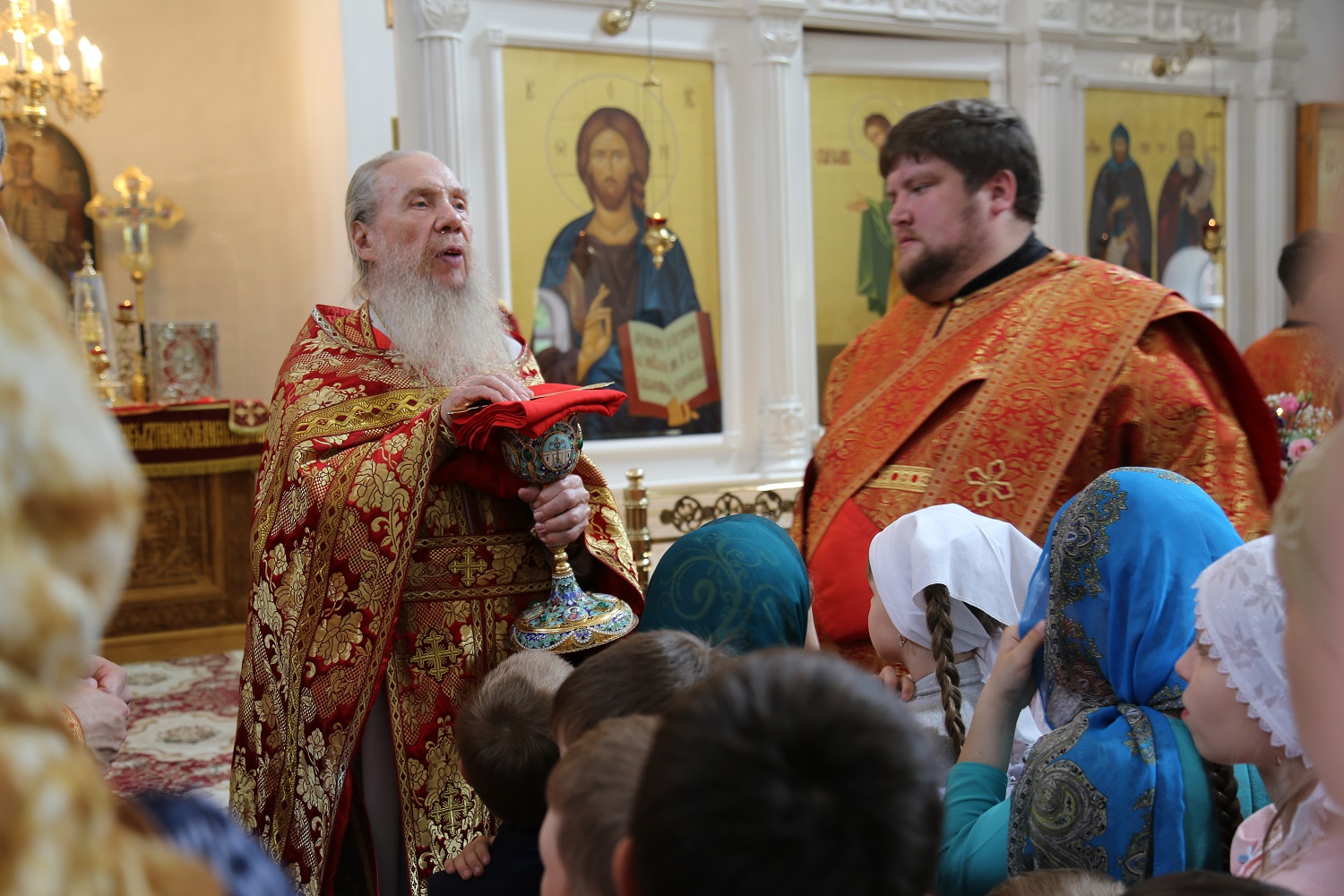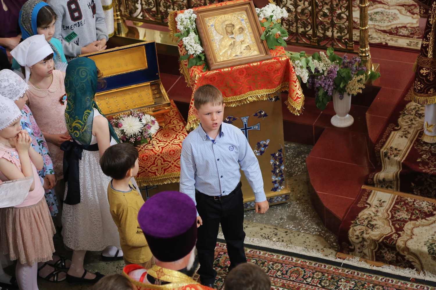 Настоятель отец Павел поблагодарил почетных гостей и архипастыря за радость совместного торжества, после чего воспитанники воскресной школы при Свято-Георгиевском соборе поздравили владыку Варлаама и всех верующих с Воскресением Христовым и престольным праздником, прочитав стихи.