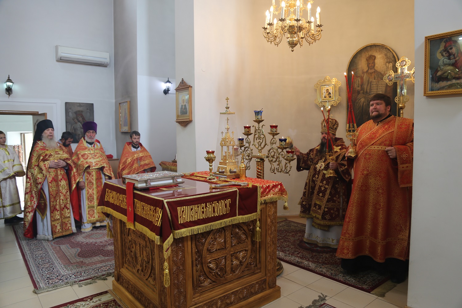 Его Высокопреосвященству сослужили благочинный Кизлярского церковного округа, настоятель Свято-Георгиевского собора иерей Павел Каликин, клирики Махачкалинского и Кизлярского благочиний.