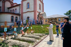 Сначала паломники помолились за Божественной литургией в соборе в честь святого великомученика Георгия Победоносца, по окончании которой благочинный Кизлярского церковного округа, настоятель собора иерей Павел Каликин совершил заупокойную литию на месте упокоения невинно убиенных в результате февральской трагедии прихожанок.