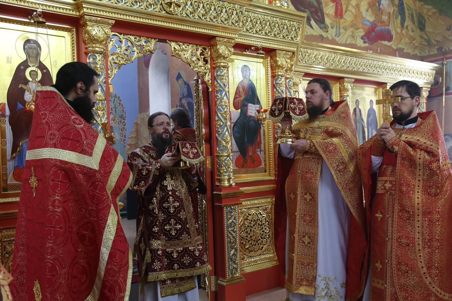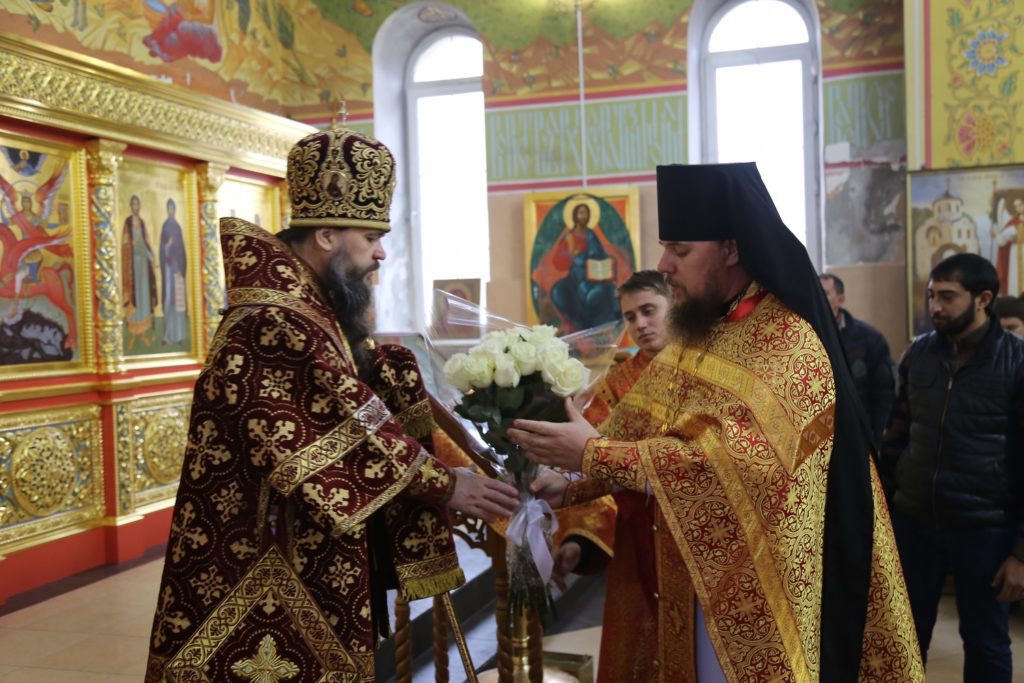 За Божественной литургией Его Высокопреосвященству сослужил епископ Тихорецкий и Кореновский Стефан, секретарь епархиального управления Тихорецкой епархии иерей Евгений Ильин, секретарь епархиального управления Махачкалинской епархии иерей Виталий Тарасов, благочинный Грозненского церковного округа иеромонах Амвросий (Марченко), клирик Тихорецкой епархии протодиакон Владимир Сушко, клирики Свято-Успенского собора г. Махачкалы.
