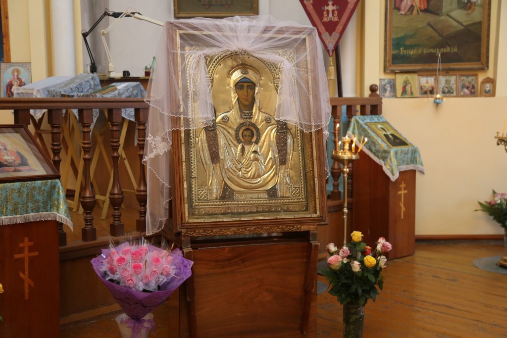 Затем перед иконой Божией Матери «Знамение» была вознесена молитва ко Пресвятой Владычице нашей Богородице и Приснодеве Марии, пропето величание и провозглашены уставные многолетия.
