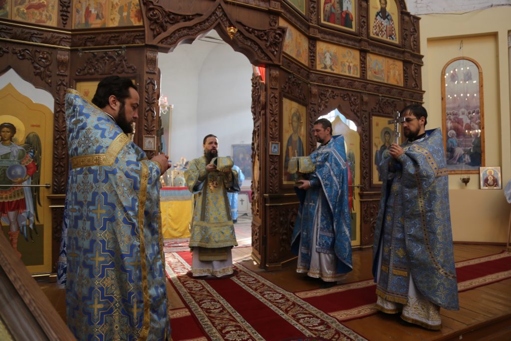 За Литургией Его Высокопреосвященству сослужили секретарь епархии, благочинный Махачкалинского церковного округа иерей Виталий Тарасов, настоятель Знаменского храма в Хасавюрте протоиерей Валерий Галкин, клирики Махачкалинского благочиния.