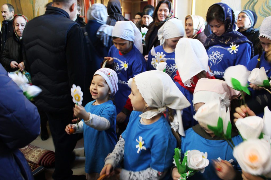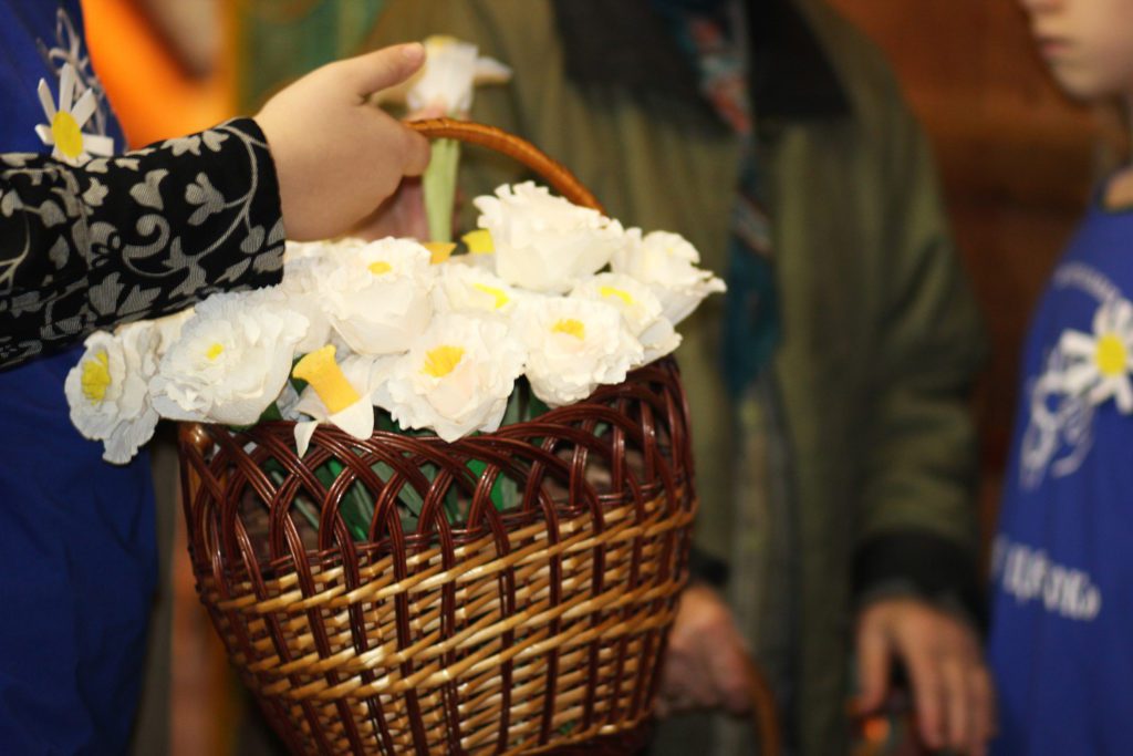 Затем воспитанники воскресной школы «Преображение» раздали всем желающим белые бумажные цветы, с любовью выполненные своими руками, в обмен на символическое пожертвование.