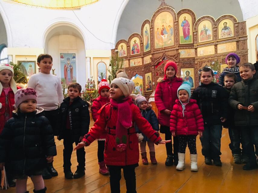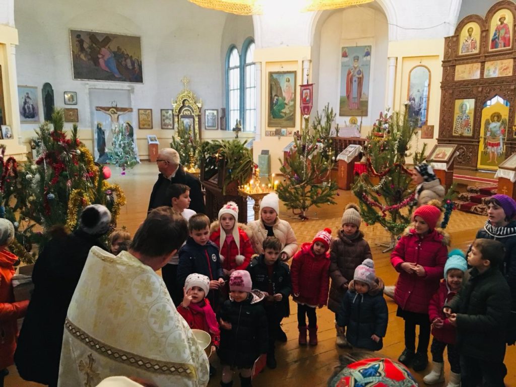 Ребята исполнили рождественские колядки и прочитали стихи, после чего настоятель Знаменского храма протоиерей Валерий Галкин вручил им праздничные подарки.