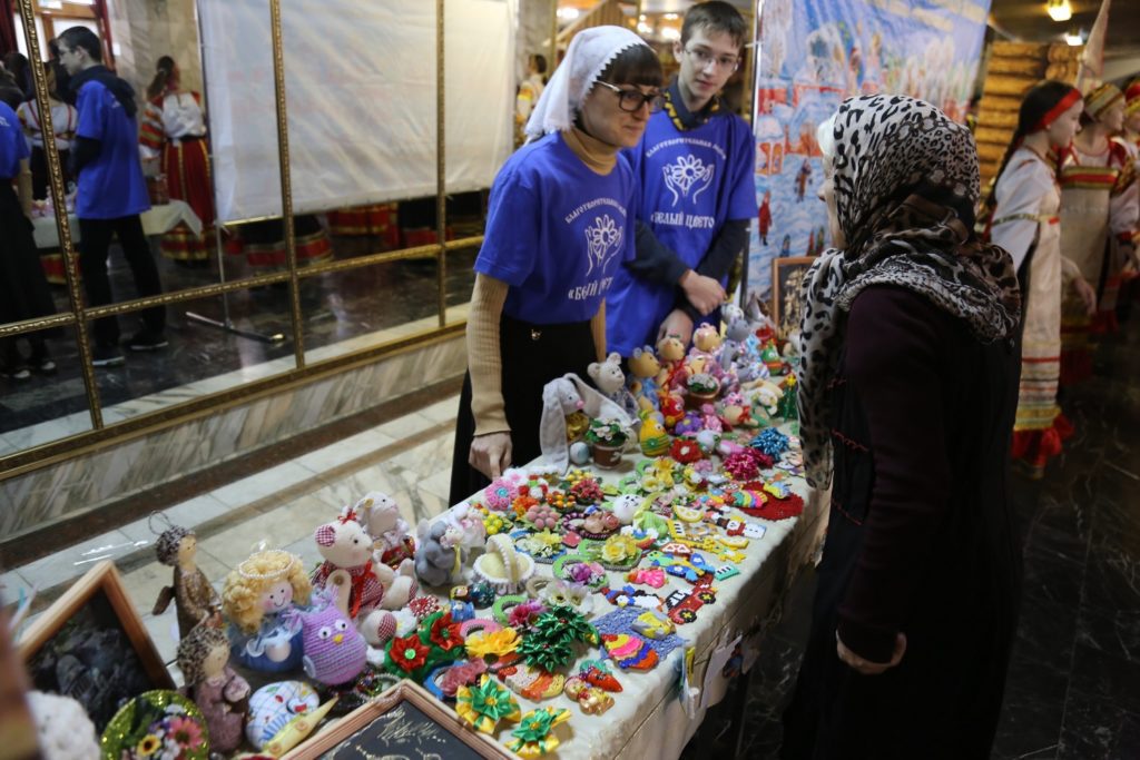 На благотворительной ярмарке были представлены поделки воспитанников воскресной школы «Преображение» при Свято-Успенском кафедральном соборе г. Махачкалы, а сами ребята встречали гостей праздника рождественскими колядками.