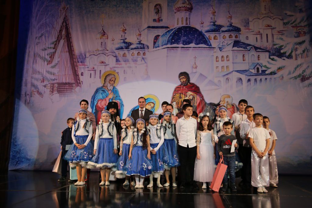 Затем ведущая мероприятия рассказала гостям и участникам праздничного концерта о благотворительной акции «Белый цветок», прошедшей во дни Рождественского поста в Свято-Успенском кафедральном соборе Махачкалы, после чего на сцену поднялись дети украинских беженцев, которым по итогам акции были собраны средства.
