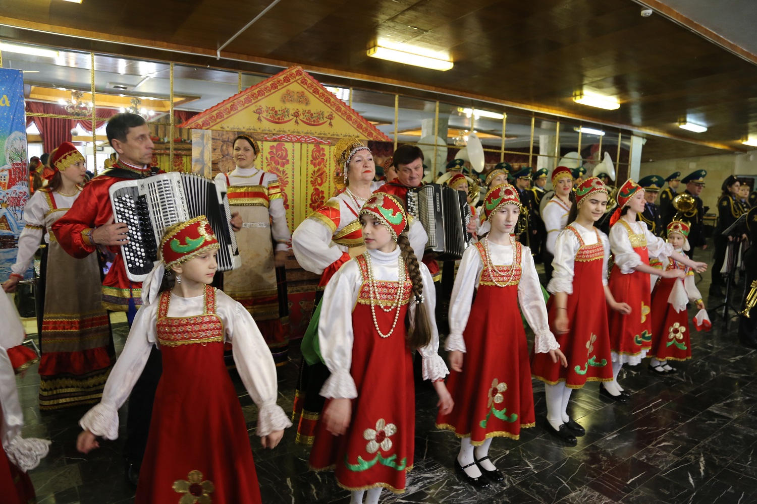 Перед началом мероприятия в фойе театра гостей встречали исполнением национальных песен хор русской песни «Волна», образцовый детский фольклорный ансамбль «Лукоморье» и духовой оркестр Управления ФСБ РФ по РД.