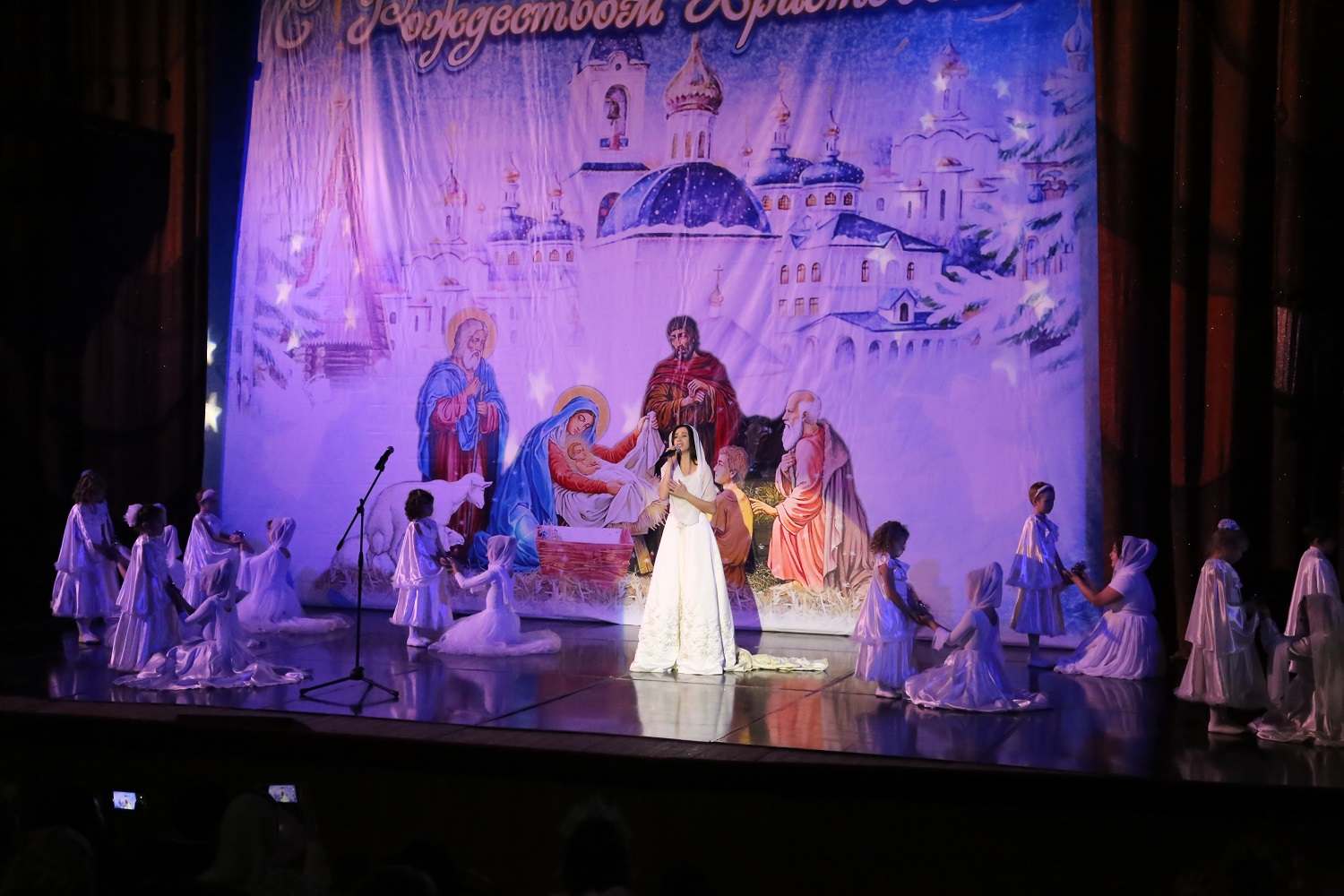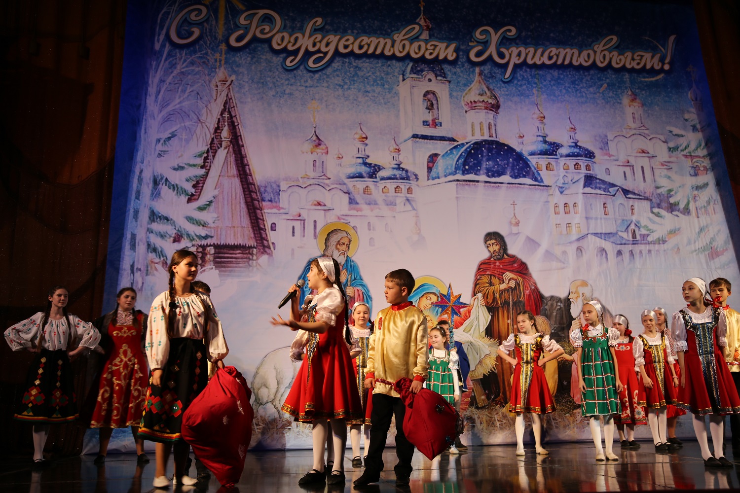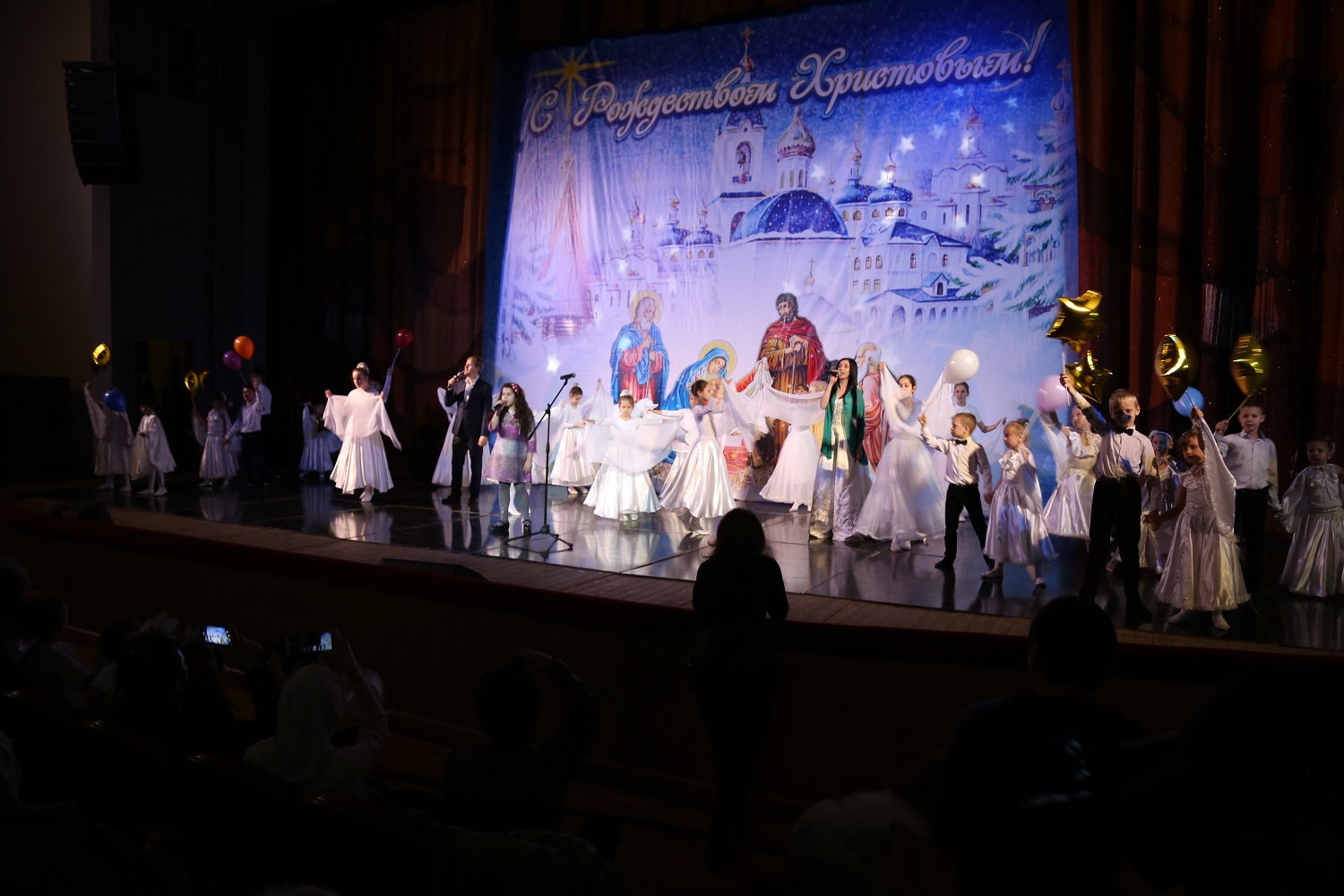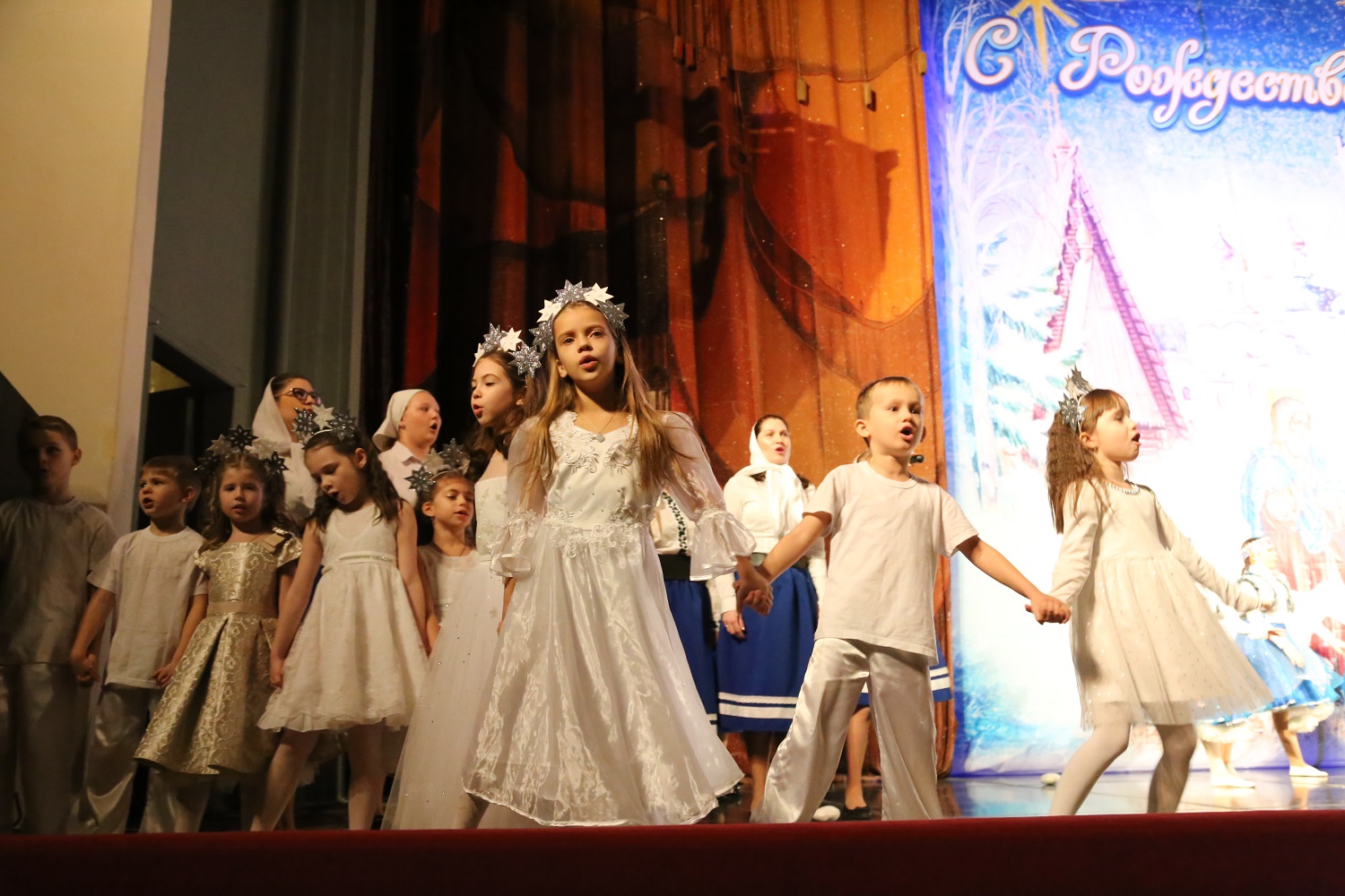 Затем ведущая мероприятия рассказала гостям и участникам праздничного концерта о благотворительной акции «Белый цветок», прошедшей во дни Рождественского поста в Свято-Успенском кафедральном соборе Махачкалы, после чего на сцену поднялись дети украинских беженцев, которым по итогам акции были собраны средства.