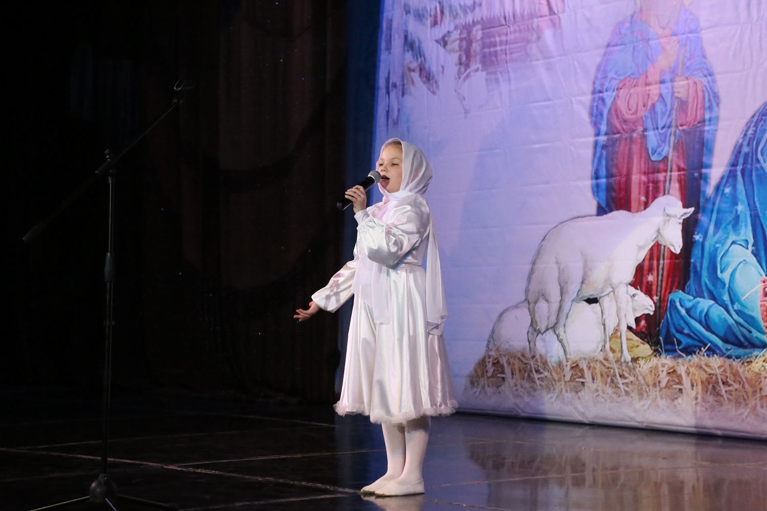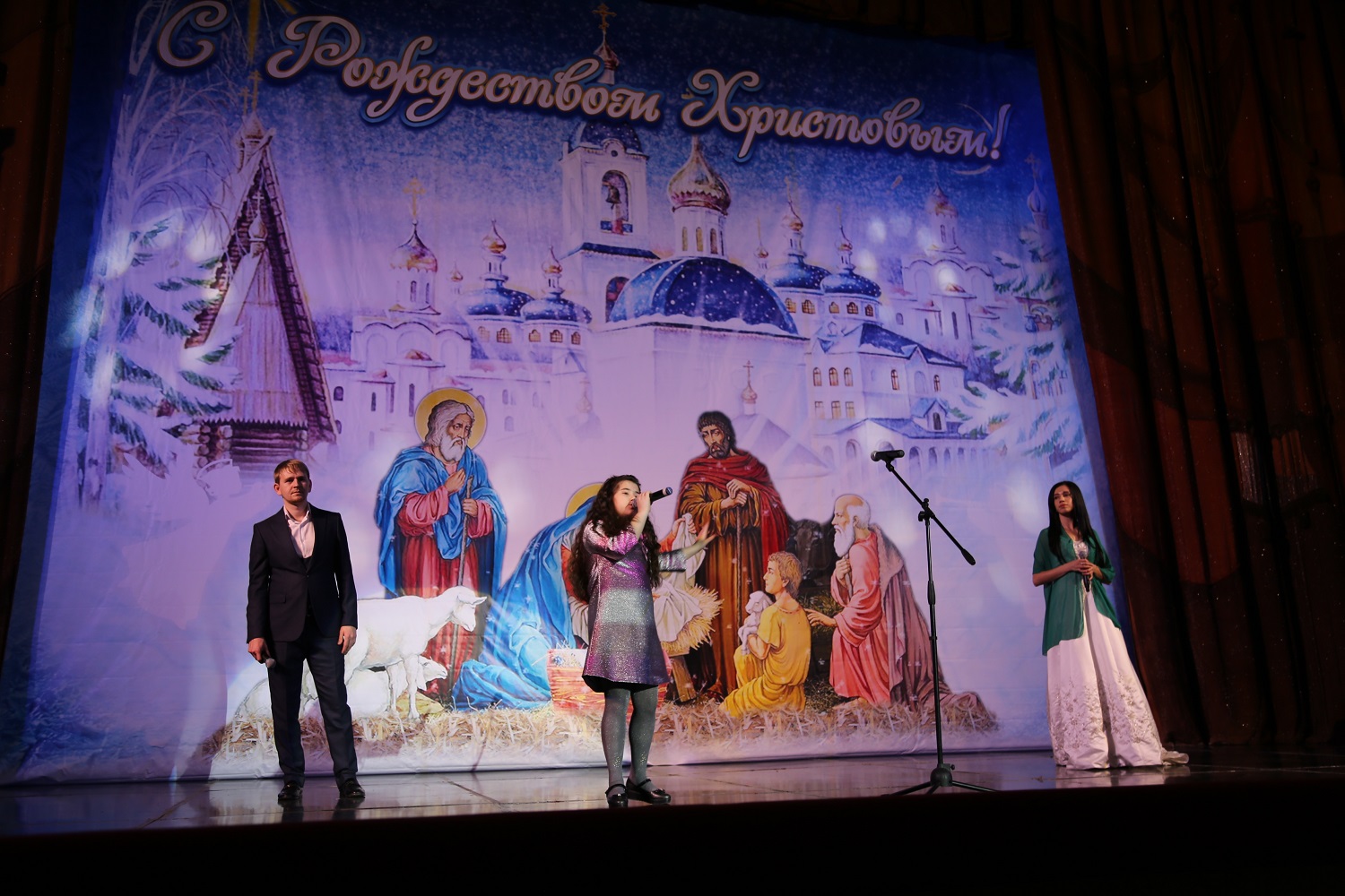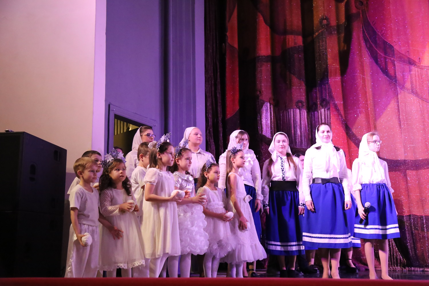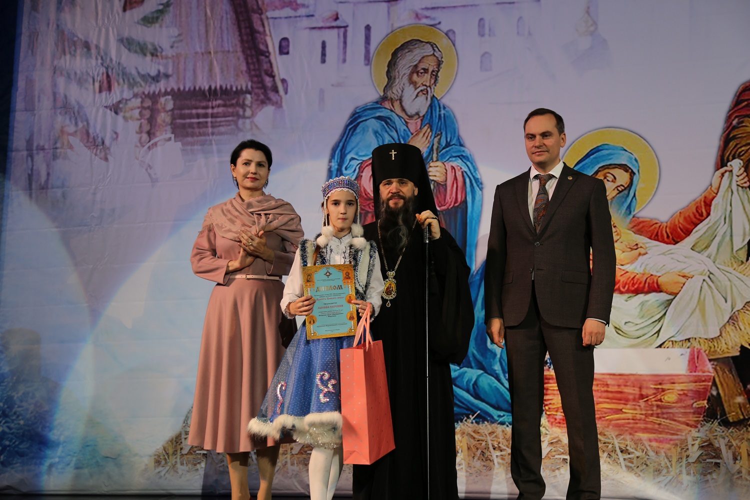 Затем ведущая мероприятия рассказала гостям и участникам праздничного концерта о благотворительной акции «Белый цветок», прошедшей во дни Рождественского поста в Свято-Успенском кафедральном соборе Махачкалы, после чего на сцену поднялись дети украинских беженцев, которым по итогам акции были собраны средства.
