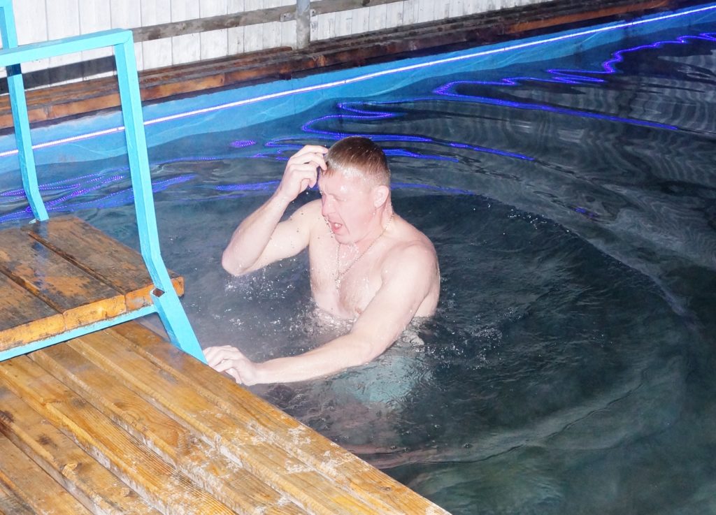 Затем клирик совершил чин великого освящения воды в подготовленном бассейне, куда смогли погрузиться все желающие.