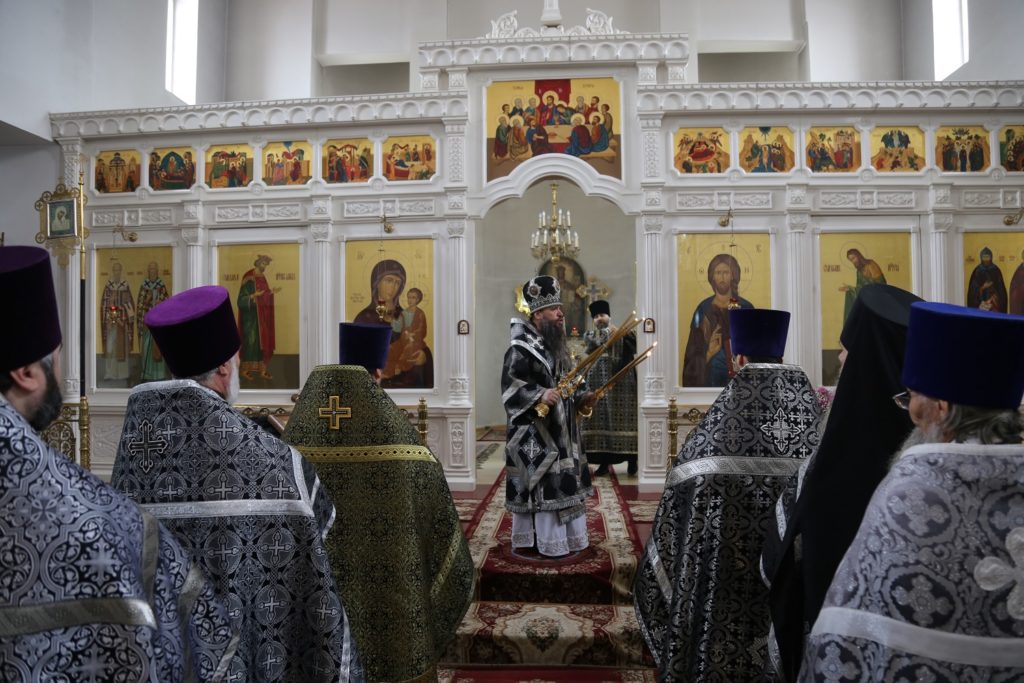 После литии, преклонив колени, иерарх вознес молитву на начало Святой Четыредесятницы.