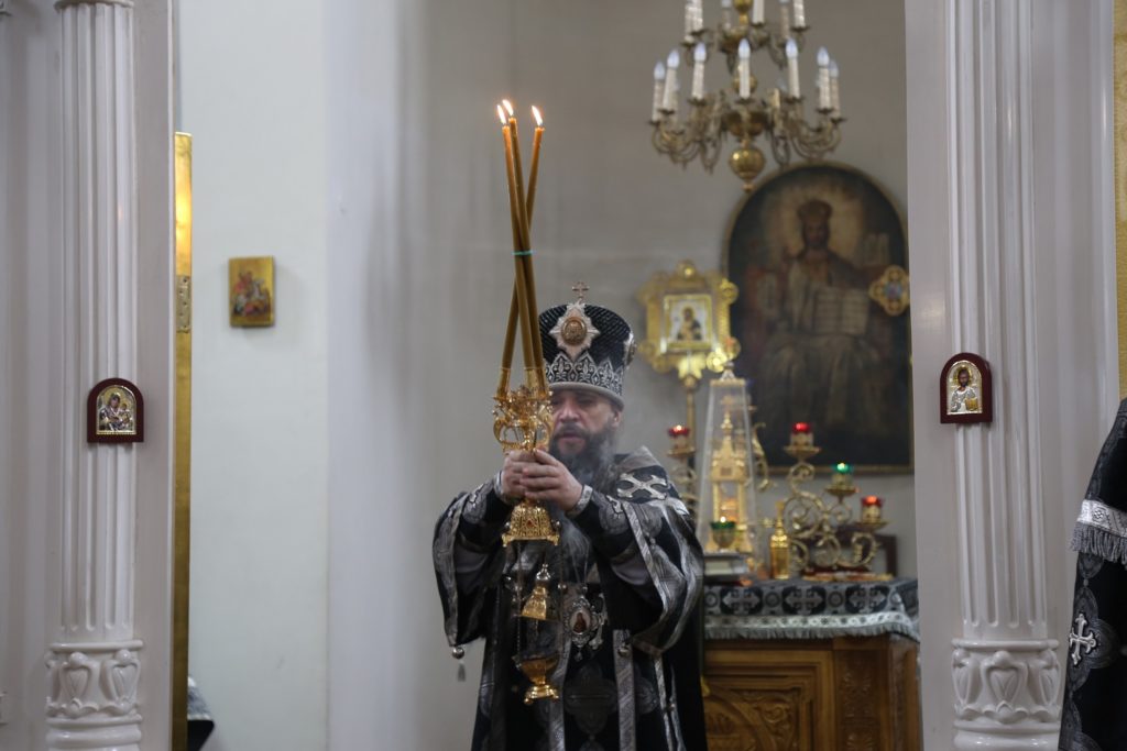 В Свято-Георгиевском соборе казачьей столицы Дагестана епархиальный архиерей возглавил чинопоследование уставных богослужений — утреню, часы, изобразительны и вечерню в соединении с Литургией Преждеосвященных Даров святителя Григория Двоеслова.