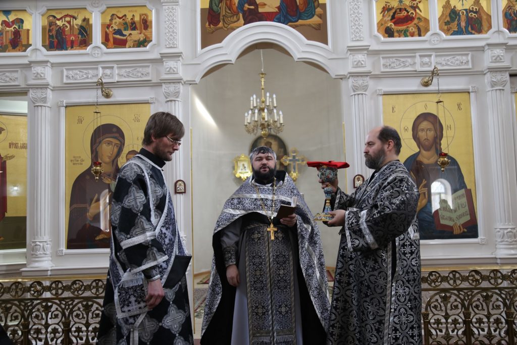 Перед принятием Святых Христовых Таин настоятель Свято-Георгиевского собора иерей Павел Каликин обратился с проповедью к прихожанам.