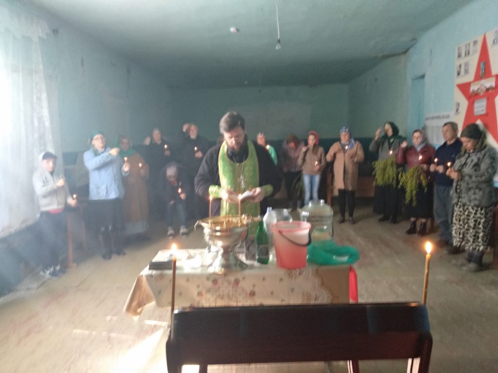 В здании местного клуба священнослужитель совершил водосвятное молебное пение, после которого окропил принесенные верующими ветви вербы святой водой.