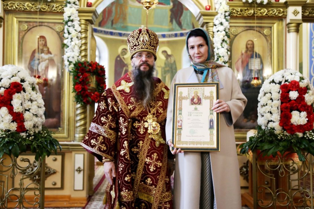 Также Патриаршая Грамота вручена заместителю председателя Народного Собрания РД Елене Ельниковой во внимание к помощи Махачкалинской епархии и в связи с 50-летием со дня рождения.