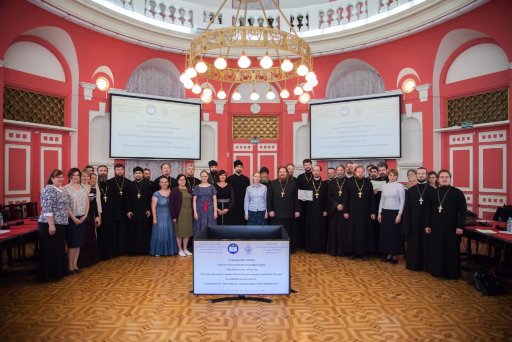 24 мая 2019 года в Московском педагогическом государственном университете состоялось закрытие курсов повышения квалификации для руководителей и сотрудников епархиальных отделов религиозного образования, директоров и преподавателей православных гимназий, учителей Основ православной культуры: «Предметная область «Основы духовно-нравственной культуры народов России» в современной школе: содержание, методика, организация преподавания».