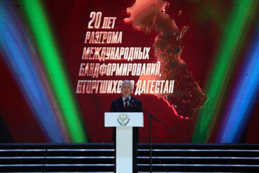 Началось мероприятие с обширной концертной программы, по окончании которой к собравшимся обратился глава региона Владимир Васильев: «В эти дни мы празднуем 20-летие разгрома бандформирований. Мудрый Расул Гамзатов сказал тогда: «Бандиты пришли освобождать Дагестан от дагестанцев. Тогда многонациональный народ Дагестана единым фронтом выступил против агрессии. Общество, армия, власть, духовенство – все объединились, чтобы остановить нападение.