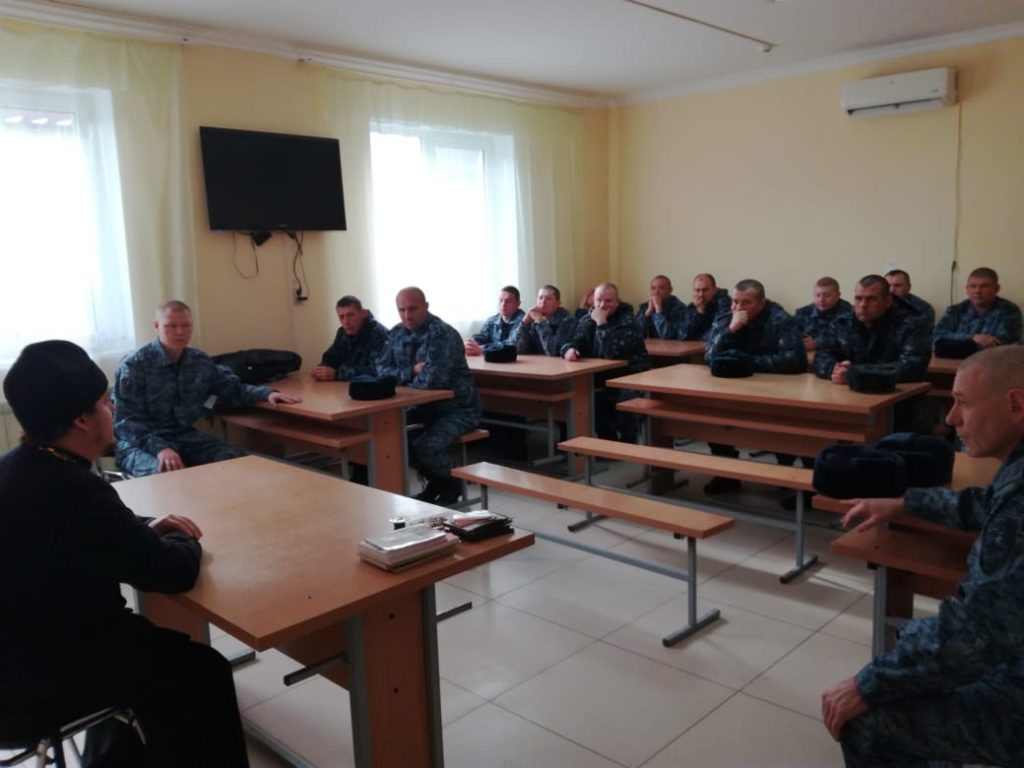 Священнослужитель провел с личным составом духовно-просветительскую беседу, в ходе которой были затронуты темы духовно-нравственного воспитания, исполнения заповедей Божиих, греха и грехопадения.