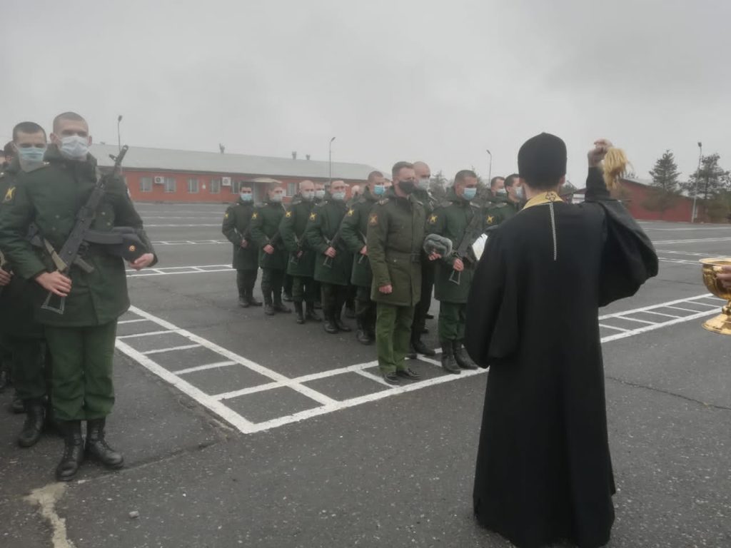 Перед новобранцами отец Андрей совершил молебное пение о призвании помощи Святого Духа на начало всякого доброго дела, после чего благословил всех присутствующих и окропил их святой водой.