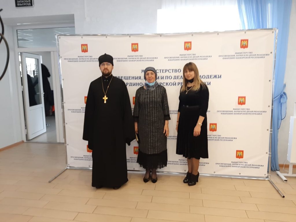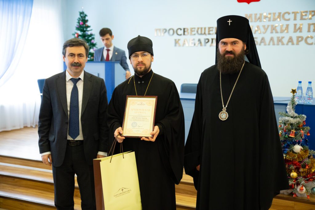В этот же день в Министерстве просвещения, науки и по делам молодёжи КБР архиепископ Феофилакт вместе с исполняющим обязанности министра Анзором Езаовым вручил награды победителям межрегионального этапа конкурса «За нравственный подвиг учителя» в СКФО. Лучшие работы окружного конкурса направлены на всероссийский этап в Москву.