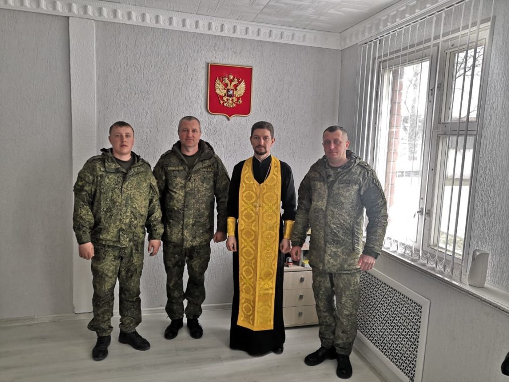 По просьбе военноначалия священнослужитель совершил чин освящения штаба батальона материально-технического обеспечения, а также отец Сергий провел беседу с офицерским составом.