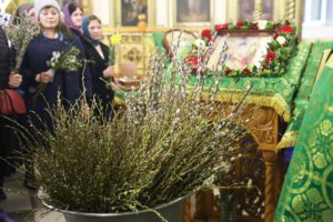 Накануне вечером епархиальный архиерей возглавил в кафедральном храме всенощное бдение, за которым по прочтении 50-го псалма вознес молитву на освящение ваий и окропил их святой водой.