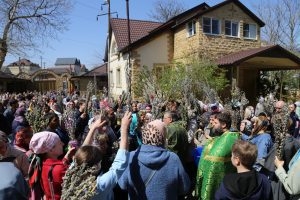 В завершение духовенство собора окропили святой водой ветви вербы, в этот день в изобилии принесенные верующими.