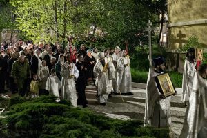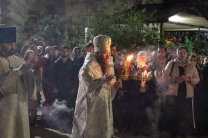 Богослужение началось с полунощницы с каноном Великой Субботы, после чего Святую Плащаницу занесли в алтарь.