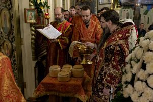 По заамвонной молитве архипастырь совершил молитву на освящение артоса.
