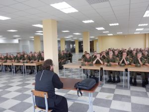 Далее состоялась встреча с личным составом на которой священнослужитель рассказал о богослужебных традициях воинской части и ответил на вопросы собравшихся, а также раздал желающим нательные крестики и иконки.
