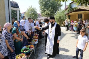 По заамвонной молитве архипастырь вознес молитвы на благословение гроздия (винограда) и всякого плода, после чего окропил дары нового урожая святой водой.