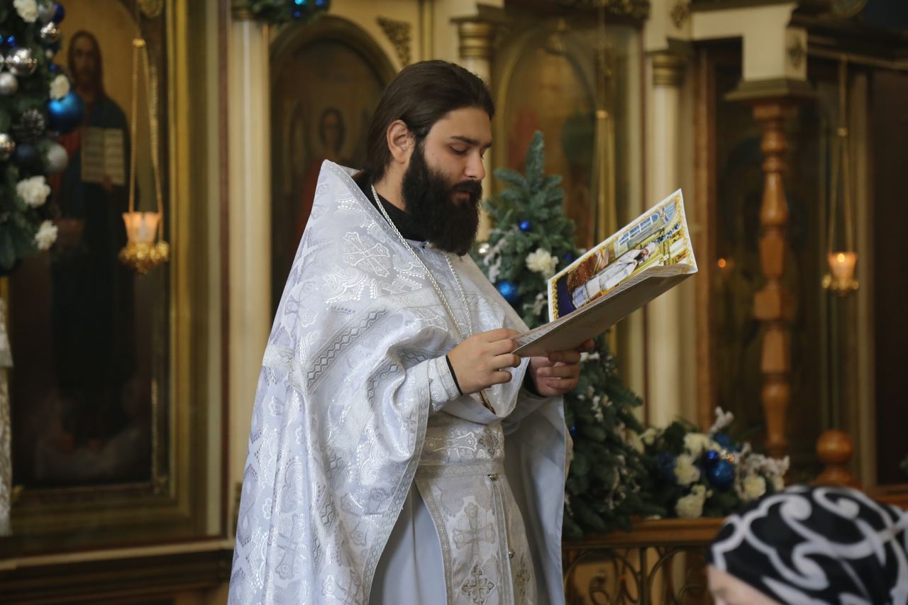 По запричастном стихе секретарь епархии иеромонах Силуан (Исаев-Баидаури) зачитал Рождественское послание архиепископа Варлаама духовенству, монашествующим и мирянам Махачкалинской епархии.